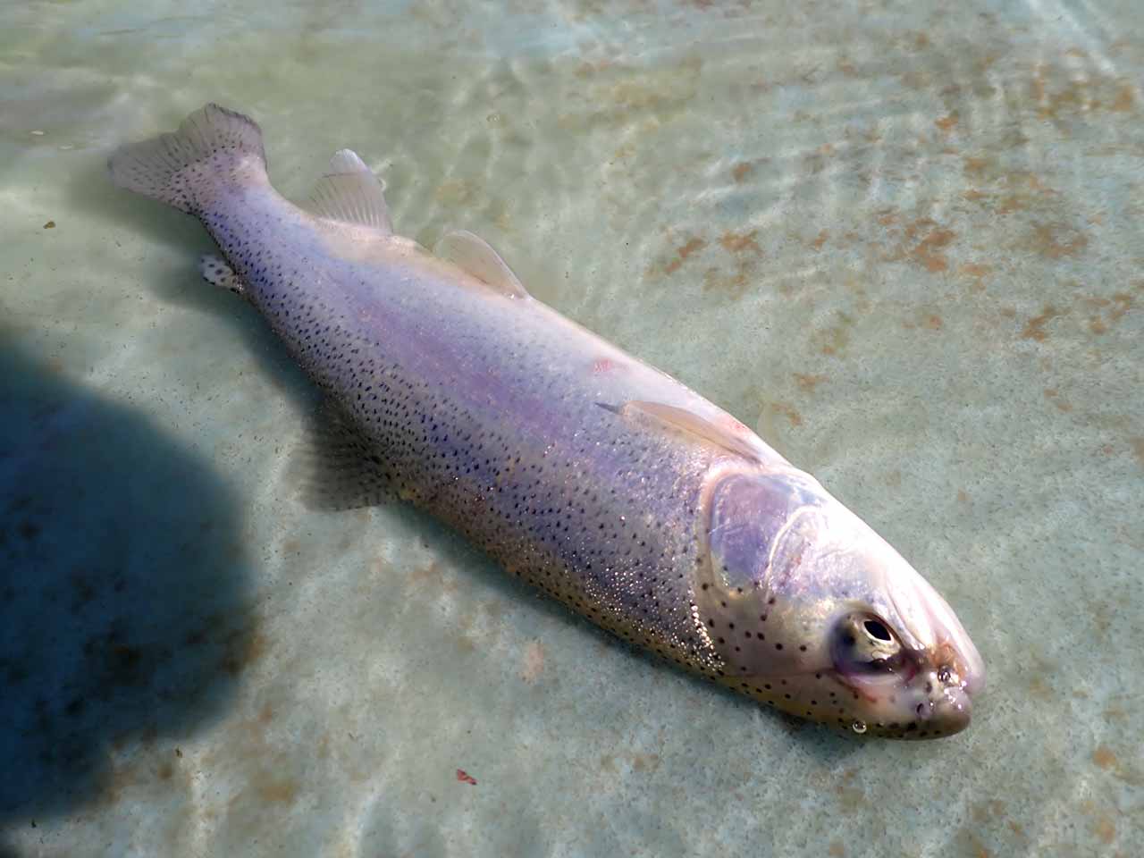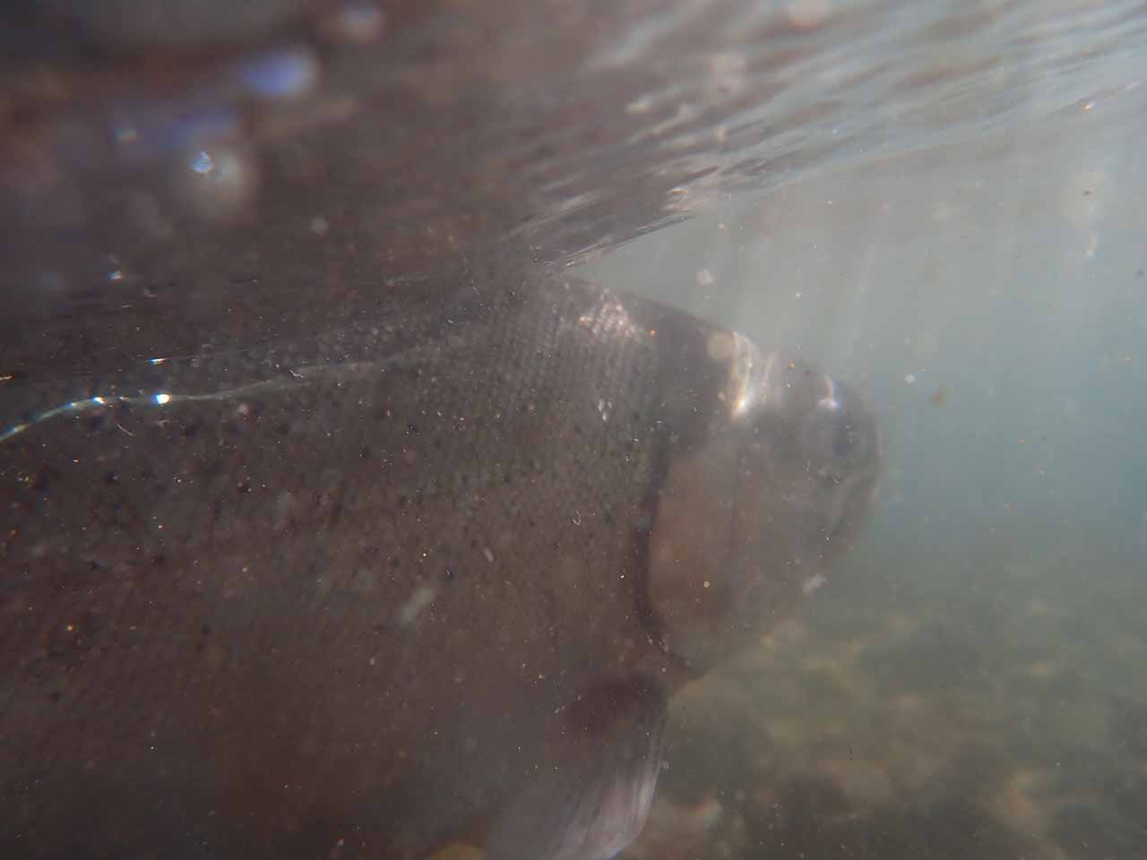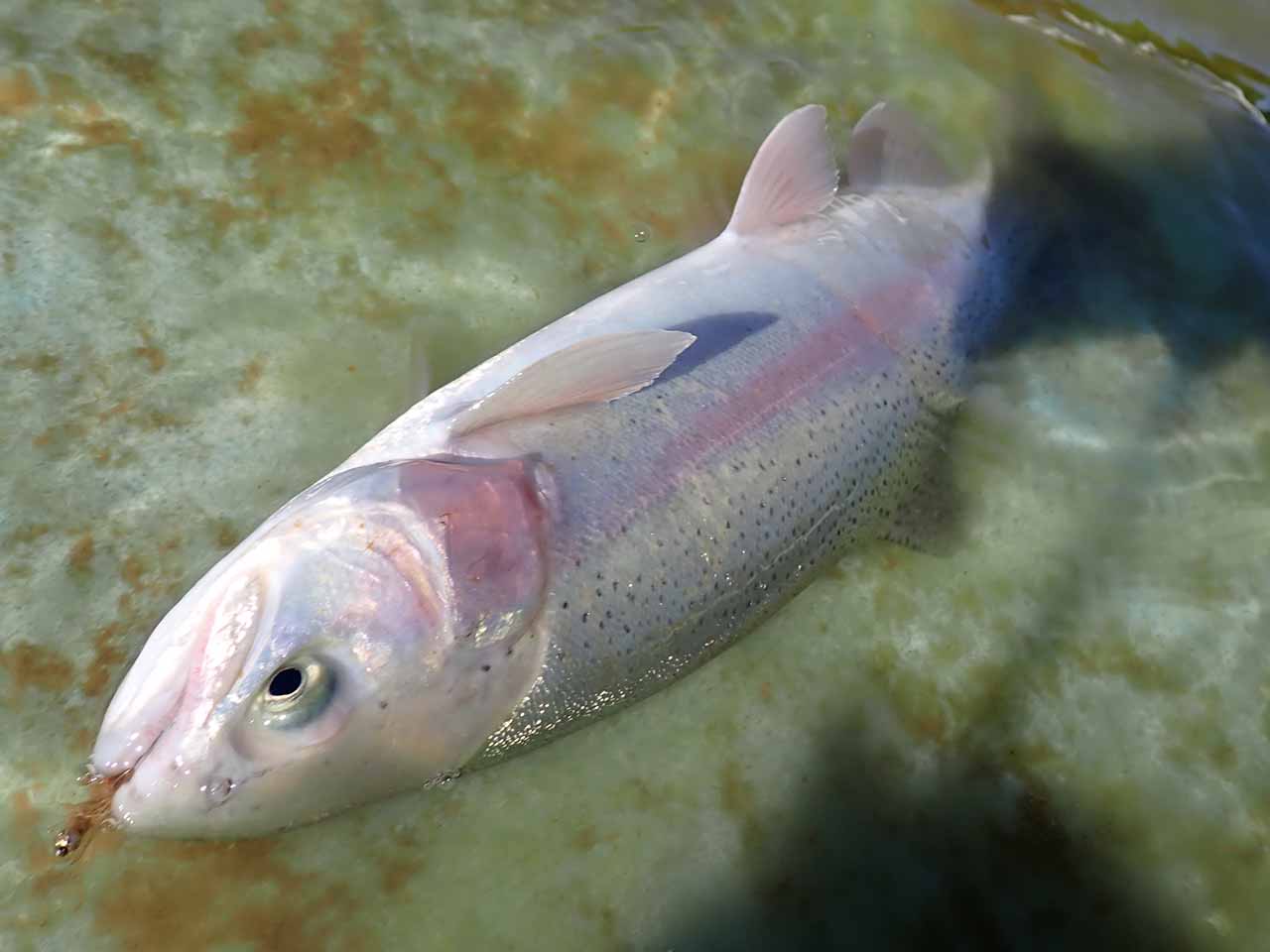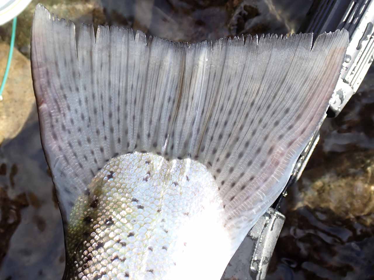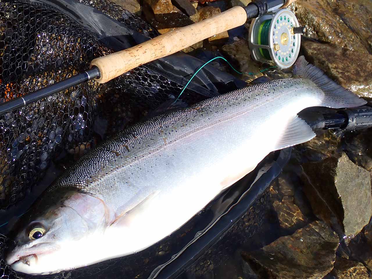 水深が無いので私のタックルはウィンストンのマイクロスペイにレージコンパクトライン。それにインターミディエイトのシンキングリーダー10フィート。ティペットは2Xを1m。フライはMSC風の大ぶりなニンフ#8とゾンカー#8を使用。お魚のコンディションは良く、サイズは50センチ前後といったところ。