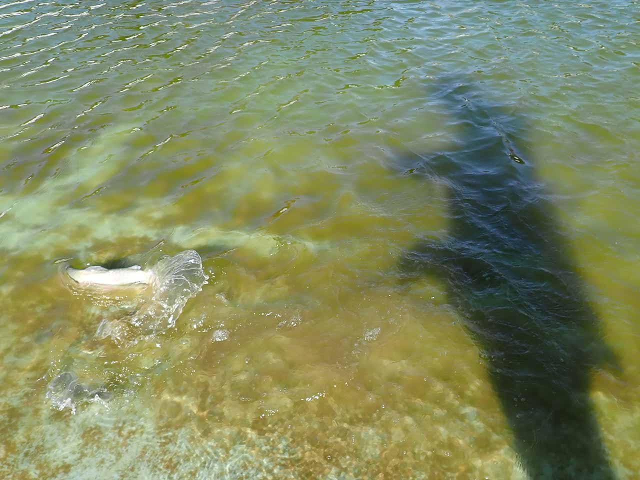 これで平常水位より少し低いとの事だが、水深はそのほとんどが膝下だった。ペローンとした流れでは魚は逃げ惑ってしまうので、主にさざ波が立つような所、あるいはちょっとしたヨレや石を探して重点的に攻めてみよう。ダブルハンドで狙うポイントをランと呼ぶが、流しやすいランが6箇所ほど点在する。ただ、現状はまだ放流が始まったばかりで、魚影は薄いので満遍なくフライを流して魚を探す必要がある。