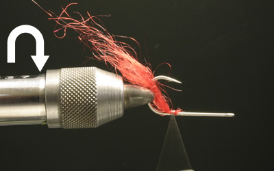タイイングポイント:ギルの留め位置は、あまりベンド寄りである必要はない。回転しないように、フックの下側にまとまって着くようにすること