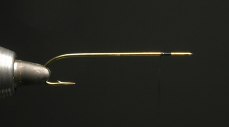 タイイングポイント:ダイイチのこのフック以外の場合はループアイではないので、気にしないで、だいたいこの位置でスレッドを巻き留める。ワックスは忘れずに。