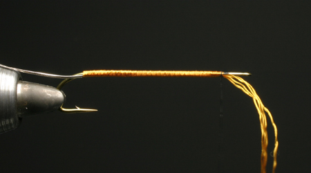 フロスを丁寧に巻き進み、ループアイのすぐ後ろまできたら、スレッドで巻き留める。 |Back|・|Top|・|Next| タイイングポイント:ボディをボコボコにしないにはこの方法が一番ラク。でもココで使っているラガータンのオーバスティンセルはちょっと高価だから、もったいない気もするけれど、これで綺麗なフライができるなら、致し方ない