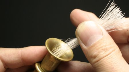 アンダーウイングとなるバックテールを約30〜40本ぐらいカット(写真の量よりやや多いくらい)。一度先端側を持ち、根元側に櫛を入れてアンダーファーを取り除く(この時点で少し減る)。再度持ち替えて、長すぎる毛と先端が折れているものを大まかに取り除き、ヘアースタッカーに入れる。 スタッカーは通常より少な目に叩き、あまりキチンと整えない方が、ストリーマーの場合はカッコイイ。 |Back|・|Top|・|Next| タイイングポイント:最終的下の写真ぐらいの量になるようにする。アンダーウイングは付けすぎ禁物。バランスが悪くなるよ