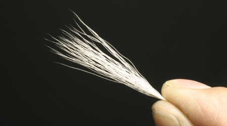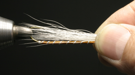 バックテールの取り付け長さはフックより若干長いかな、と思うくらい。右手に持って長さを調整。位置が決まったらスレッド3回転くらいで巻き留める。 |Back|・|Top|・|Next| タイイングポイント:人によってはもう少し短い人もいる。バックテールは巻き留める時に締めすぎるとフレア(広がること)してしまうので、アイ側はきつめに巻いて、テール側は緩めに巻き留める。スレッドにワックスが充分効いていないと、マテリアルが滑るので注意