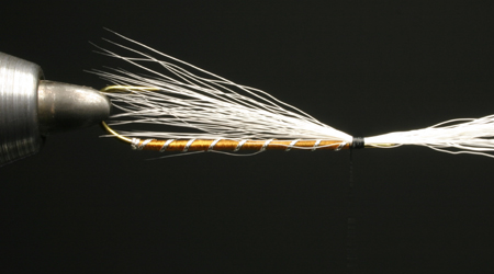 バックテールを巻き留めるとこんな感じ。この写真でもややフレア気味。欲を言えば、フックのポイントより外側にはみ出ない方がカッコイイ。 |Back|・|Top|・|Next| タイイングポイント: 撮影とタイイングを一人で同時に行っているので、フライのクオリティが今一歩でも怒らないで。大変なんだから。スレッドワックスは巻き留める前に、さらに念入りにかけておくと良い