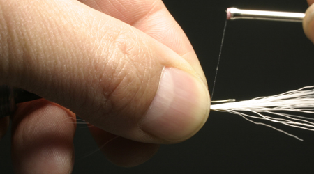 クレストの位置が決まったら左手に持ち替え、1回転だけ軽く仮止めをする。一度手を放して、綺麗についているようであれば、クレストが動かないように気をつけながら、アイの方向へ数度巻き留める。