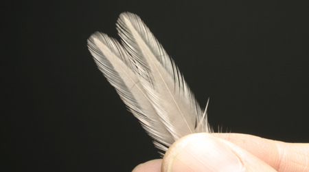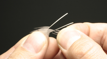 ヘンハックルを二対ケープから選び出す。大きさはフックシャンクの長さの、約1.2倍くらい。曲がっていない真っ直ぐなものが理想。根元のウェッブをむしり取り、次の写真18の取り付け位置になるように、大きさを加工する。 |Back|・|Top|・|Next| タイイングポイント:左右を背中合わせで揃えて、大きさを整えるとやりやすい。むしりすぎに注意。 オリジナルは確かコックハックル4枚で作っているけれど、コックハックルはスカスカなので、4枚使ってボリュームを出すが、ヘンだと芯に近い方が密なので2枚でもボリュームが出せるメリットがある。最近のヘンは光沢もあるしね。ま、どちらで巻くかは好みの問題だと思います。