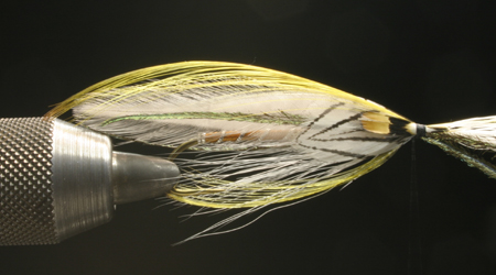最後にジャングルコックを小魚の目をイメージして取り付けます。ジャングルコックも同様に一編に付けずに一枚ずつ位置を確認しながら取り付けましょう。