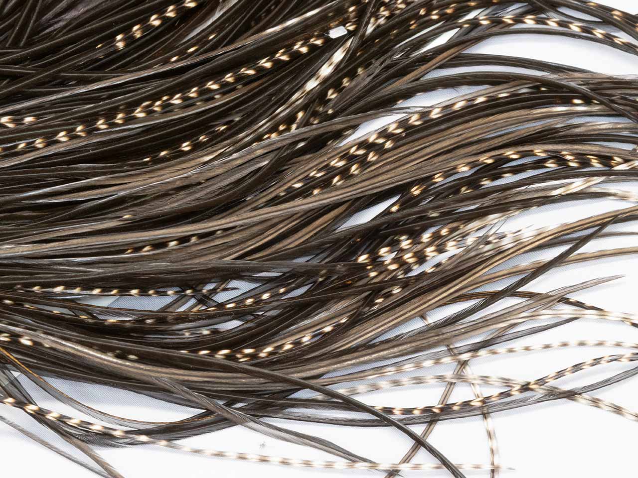 現在はホワイティング同様のグレード分けで届き、カラーだけがお店に届くまで分からないというもの。そして今回ハーミットに入荷してきたライトジンジャーダンです。メイフライのボディカラーやウイングに多いカラーで、その雰囲気を想像しただけで巻きたくなります。毛の質感はハイ&ドライで、ファイバーの長さが均一。比較的大きめのハックルも取りやすいので、12〜16番が作りやすいと思います。ヘリテージのサドルは他のモデルと同様にとても長いので、一本で8〜10本ほどのドライフライを巻くことが可能です。
