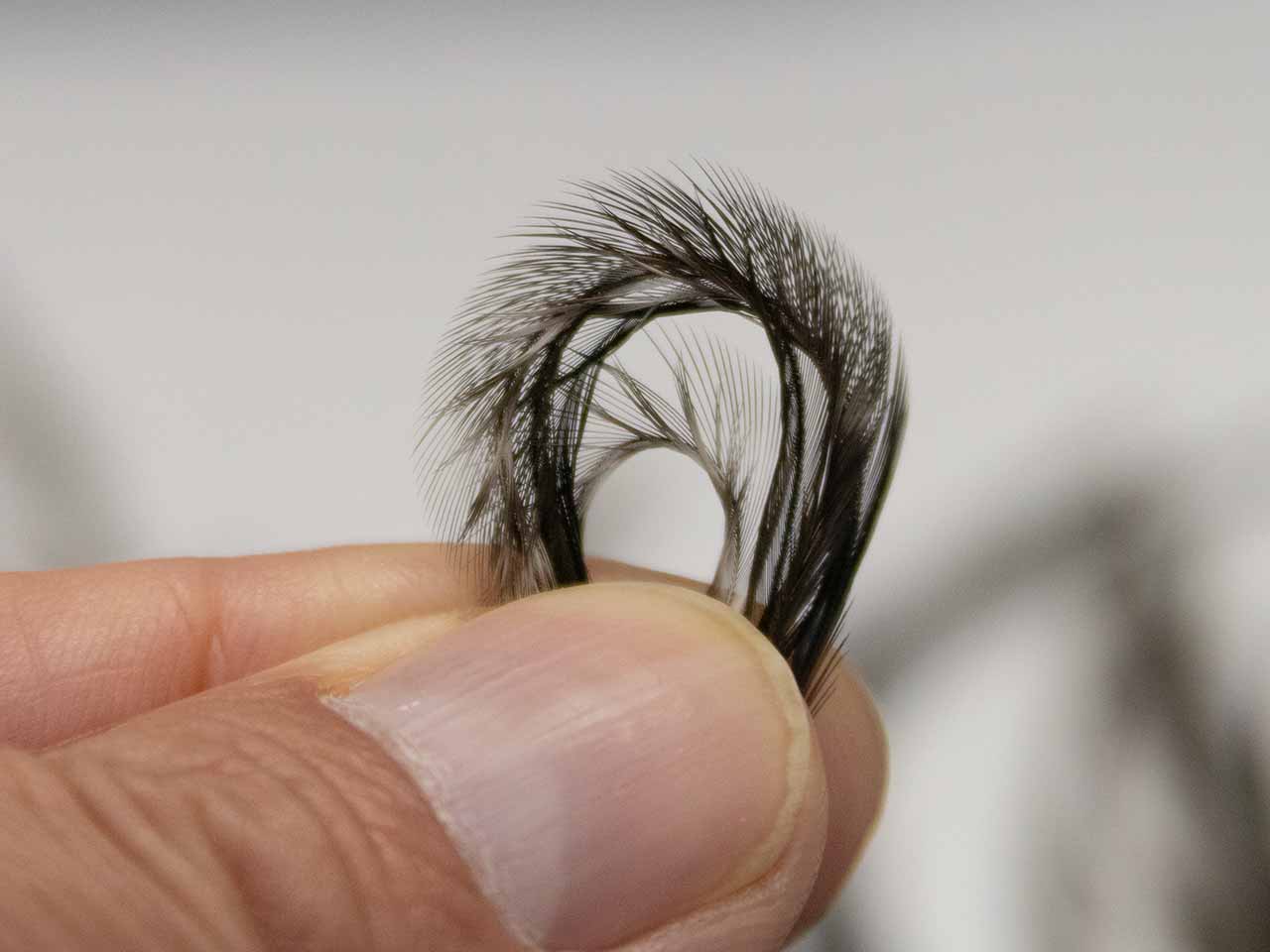 現在はホワイティング同様のグレード分けで届き、カラーだけがお店に届くまで分からないというのがこのヘリテージハックル。そして今回ハーミットに入荷してきたブラックです。テレストリアルフライには不可欠なナチュラルカラーのブラックと、要所にグリズリーが生えています毛の質感はハイ&ドライと同じでファイバーの長さが均一。比較的大きめのハックルも取りやすいと思います。ヘリテージのサドルは他のモデルと同様にも長いので、一本で8〜10本ほどのドライフライを巻くことが可能です。
