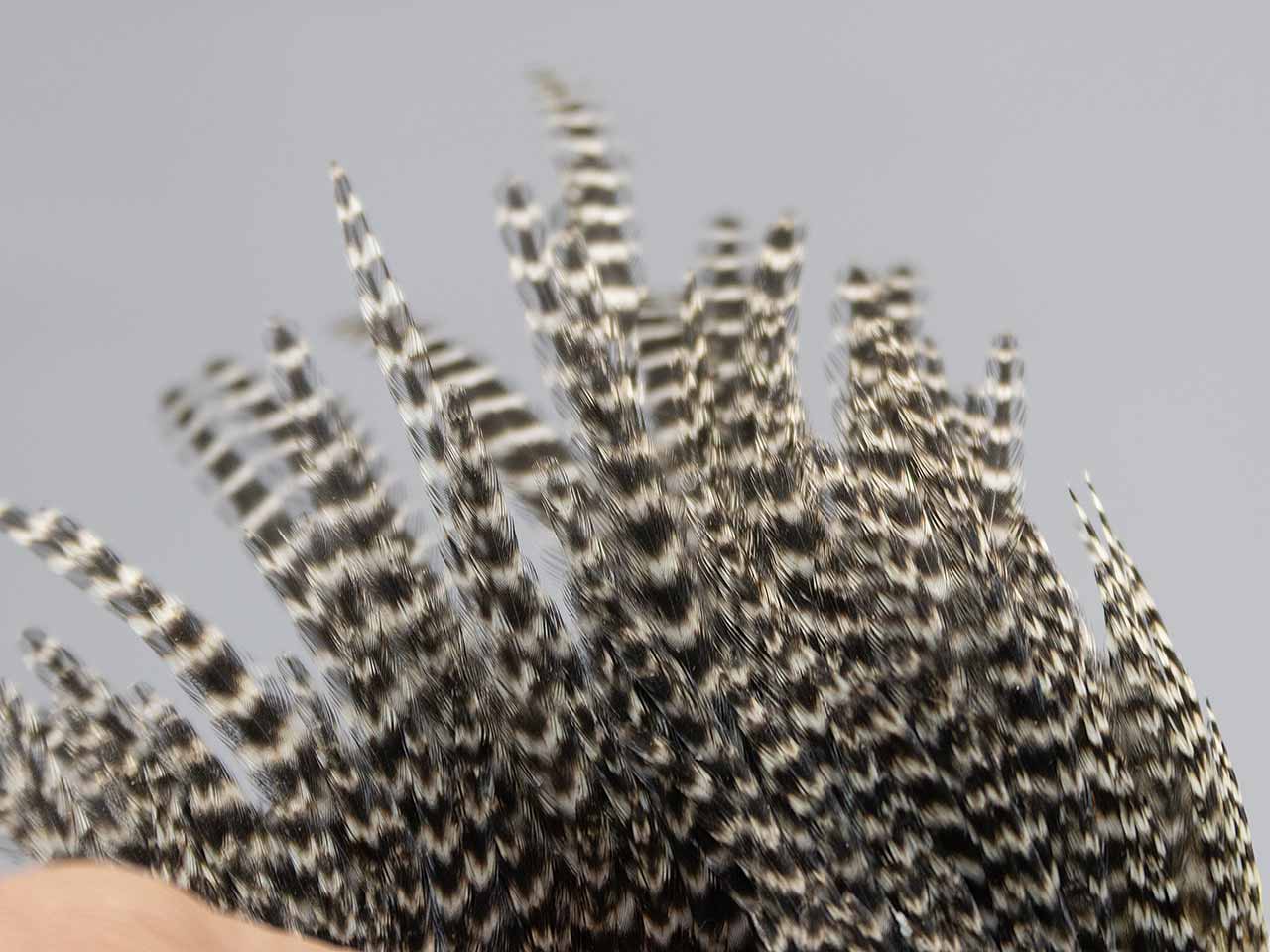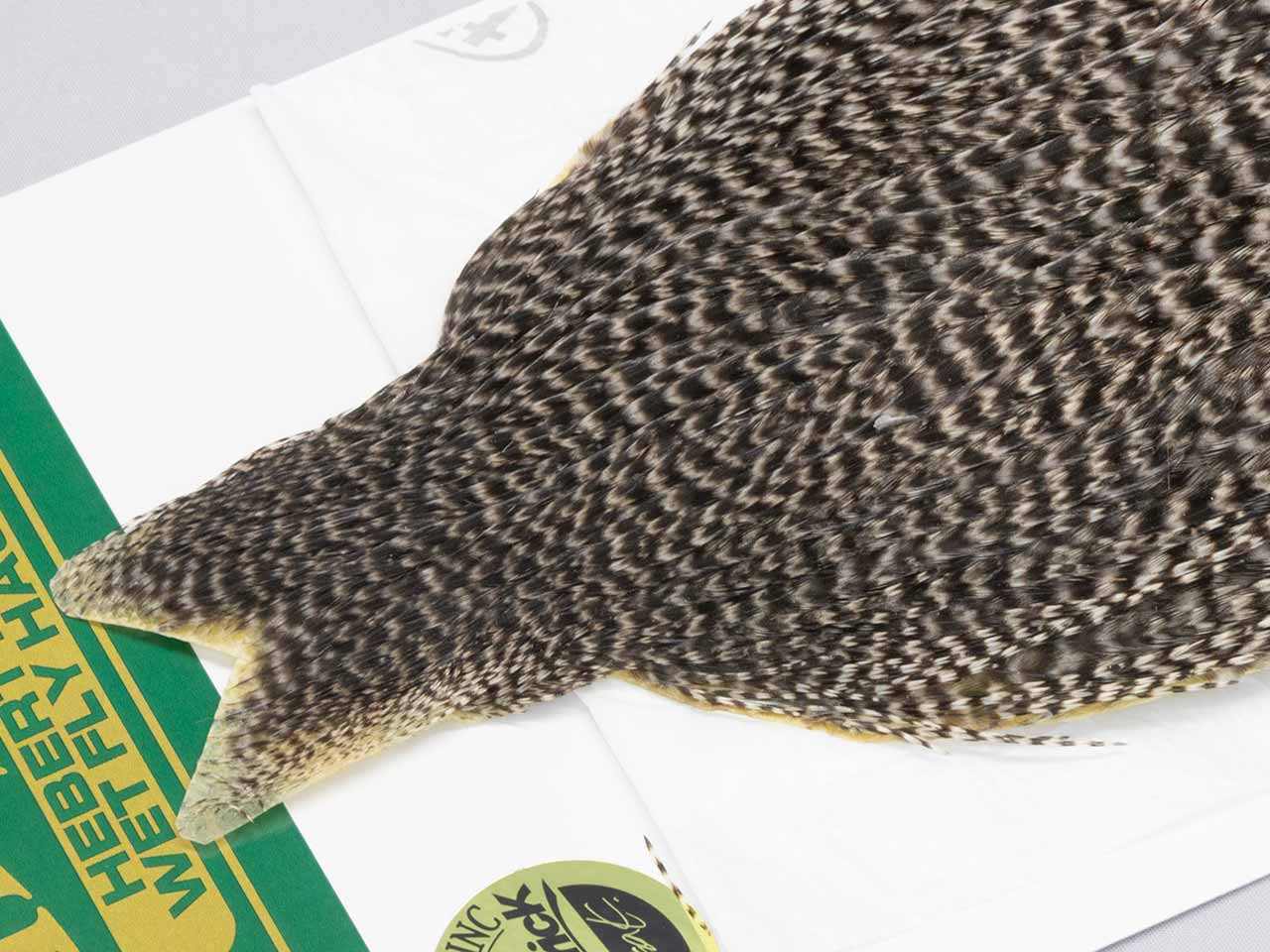 ヘンケープは特に卵を生むメスですから、入ってくる量は極めて少ないです。そしてヒーバートはホワイティングのヘンケープよりも一回り大きい個体で、ナチュラルカラーが中心。グリズリーはストリーマーのウイング、ウーリーバガーのハックル、大きいドライのハックル、テールなど色々と使えます。ハックルだと10〜14番くらいで使えるしなやかな毛質。