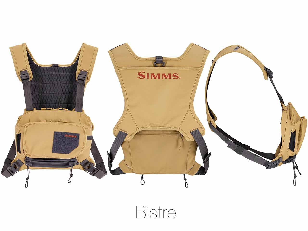 トリビュータリーのハイブリッドチェストパックは2026年にフルモデルチェンジし、雰囲気はヘッドウォーターヒップパックの生地を使ったシンプル版といった感じになりました。ヘッドウォーターの様なカチッとしたモールドの型ではないので、足元の視界は遮られにくく、そしてシンプルな構造なので、タックルを無駄なく配置できます。背面は以前のモデルと同様に、ランディングネットの柄を指すホルダーを装備。底部には両サイドから入れることができる、水筒やラインウェアを留めておけるストレージがあります。道具が少なくシンプルにまとめたい方に人気があります。