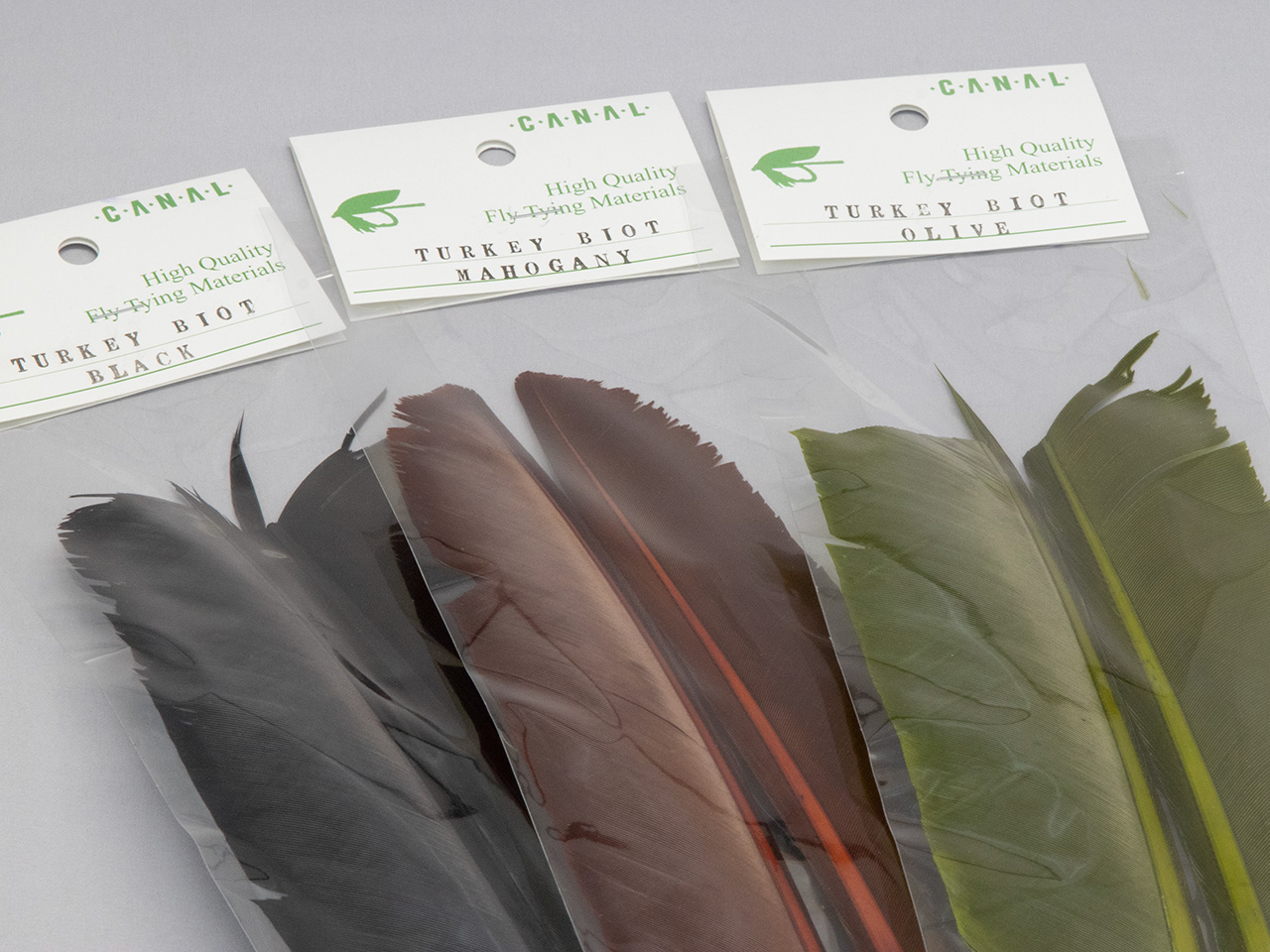 日本で染めているキャナルオリジナルのターキーバイオット。使うのは軸の内側にある短い方を一片使うので、一袋あればたくさんのフライを巻くことができます。グースバイオットよりも一回り大きいので12番くらいのフライまで対応できるでしょう。発色がよく、色の濃淡がよく出る。巻き始めの方向により、フリュが立ったり、ツルッとした濃淡のボディに仕上がります。また、グースバイオットと違い、反対側も同じようにボディ材にしたり、ウイング素材として使うこともできます。