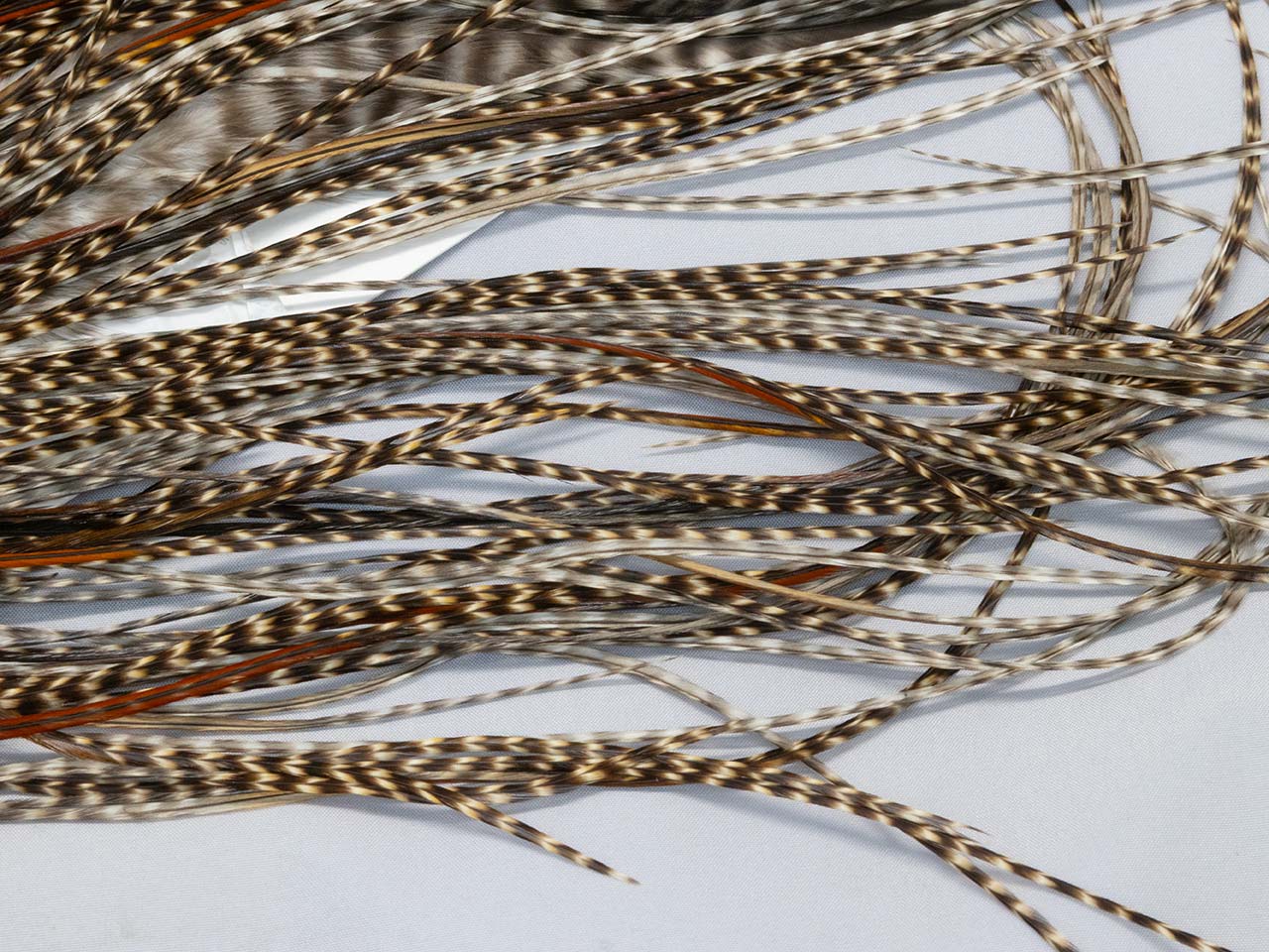 現在はホワイティング同様のグレード分けで届き、カラーだけがお店に届くまで分からないというものがヘリテージケープ。そして今回ハーミットに入荷してきたグリズリーです。ブランカラーが強いコントラストのあるストライプと、ブラウンハックルも生えているので、多様なカラーが楽しめます。毛の質感はハイ&ドライを受け継ぎファイバーの長さが均一。比較的大きめのハックルも取りやすく、14〜16番が作りやすいと思います。ヘリテージのサドルは他のモデルと同様にとても長いので、一本で8〜10本ほどのドライフライを巻くことが可能です。