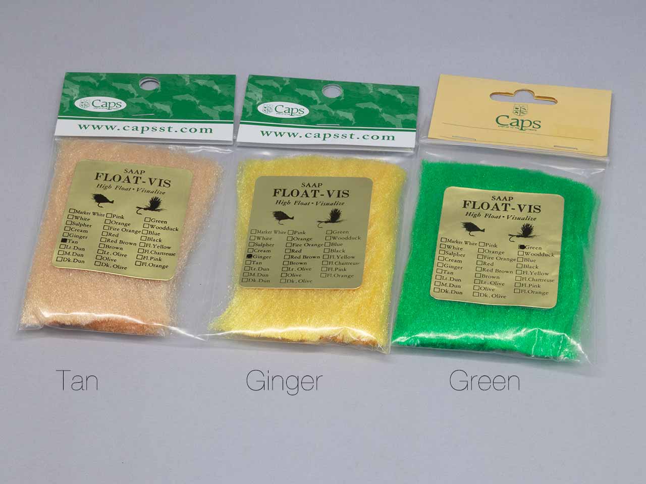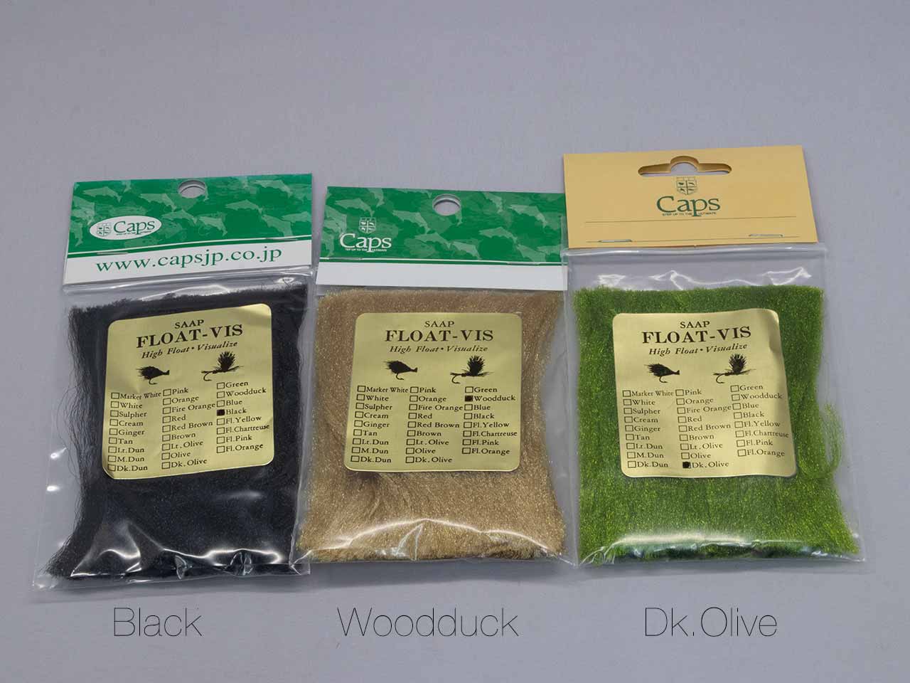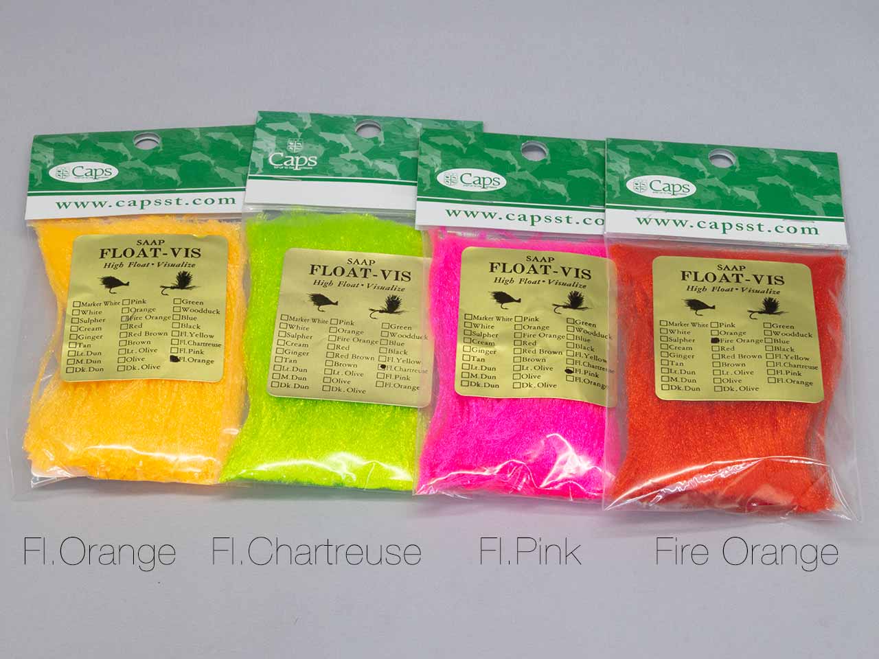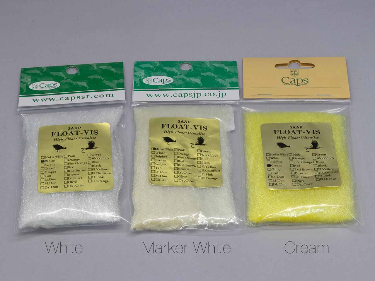 浮力が抜群(吸水性が無い)のマテリアルです。約85mmの繊維の束でエアロドライウイングと比べると、束の量を自分の好みで太さが変えられる点が優れています。明るい色ははパラシュートフライのポストウイング。ナチュラルカラーはダンのウイングやマシュマロボディを作る時など、クリーム系はシャックとして使います。マーカーホワイト(ナチュラルホワイト)は名前の通りそれを束ねてヤーンマーカーに最適です。レッドはフローティングミノーを代表する、ストリーマーのギルに使いましょう。