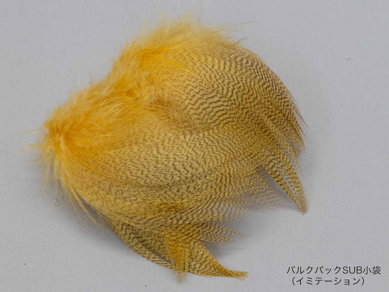 沢山巻きたい方はイミテーションウッドダックまたはサマーダックという名前で売っているものを使います(マガモのボディフェザーを似た色に染めたもの)。そちらの方が安価で一般的に流通量が多いです。表示のSUBは「サブスティチュート/代用の意」です。