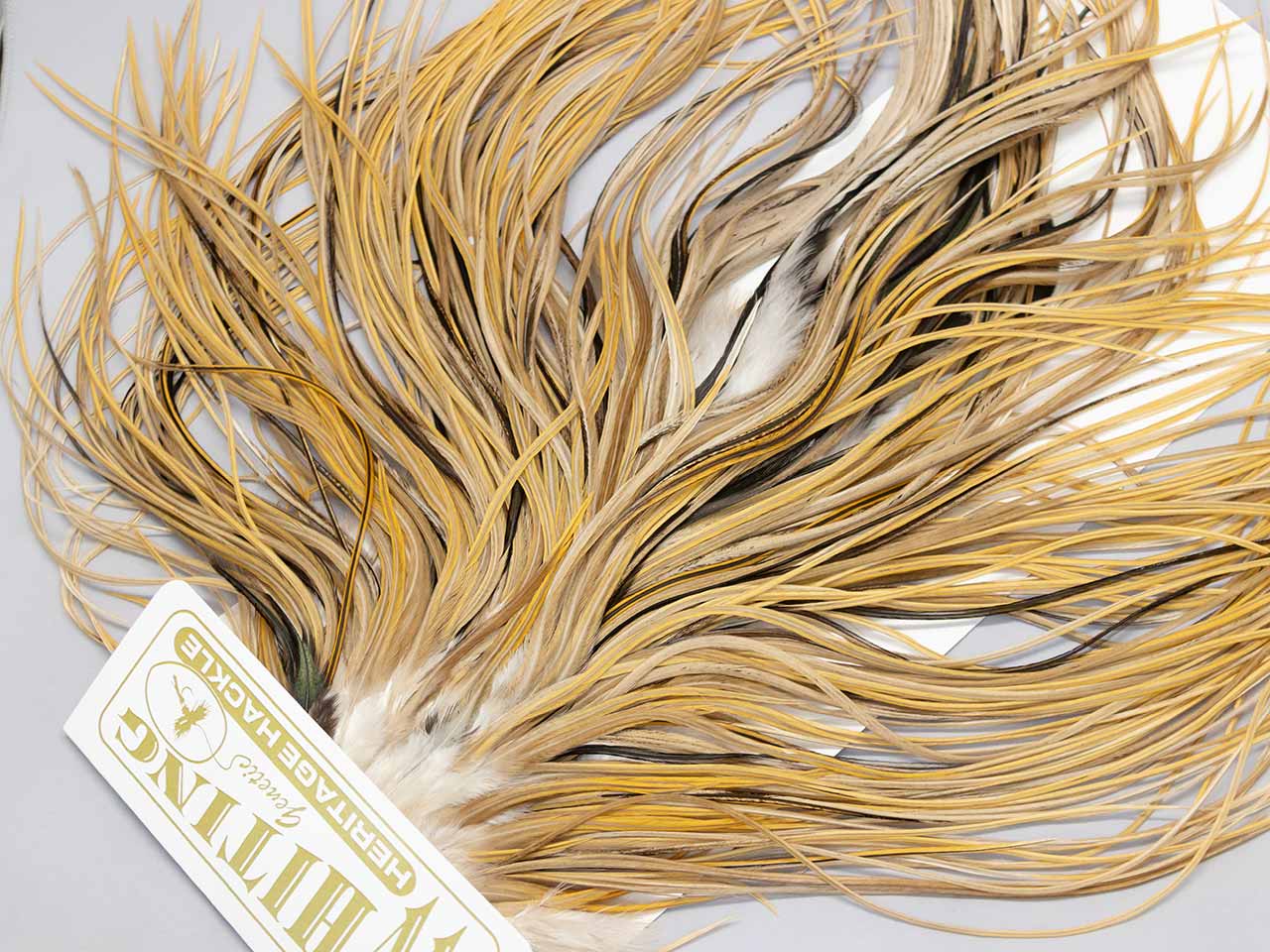 ホワイティングハックルは通常のスタンダードハックルの他にハイ&ドライ、アメリカンハックル、スペイハックルなどがあります、ハイ&ドライはドライフライ用のハックルで、特に浮力を必要とするパターンに向いたファイバーのコシと密度があります。