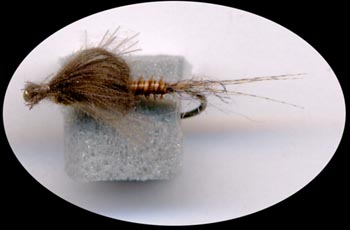 CDCをウイングケースに使った、フローティングニンフ。気泡を抱くので、浮力の持続力が有ります。結構簡単に巻けそうなのですが、ウイングケースとレッグのバランスが難しく、このフライそっくりに作るのは難しいです。それと、テールの上に乗せられたシャックのマテリアルが、何なのかがわかりません。ジーロンにも見えるのですがそれよりはかなり細いマテリアルを使用しています。このフライパターンはスレッカラシのヤマメにめちゃくちゃイイです。