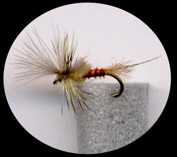 ウイングに使われているCDCは、どちらかというとインジケーターの役目で、ハックルがパラシュートフライと同じ姿勢で、水面をとらえます。浮力材は全体にまぶさず、ハックルとCDCだけにつけるようにして使いましょう。名前の通り、何をやってもダメなとき、最後に使う切り札です。私はこのフライで結構良い思いをしています。こちらは色違いのラスティ。