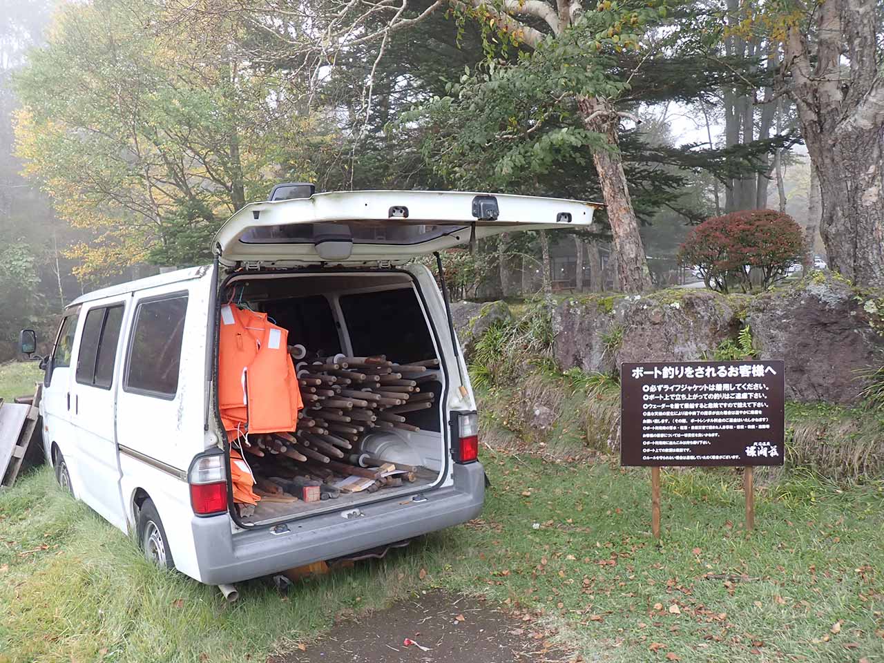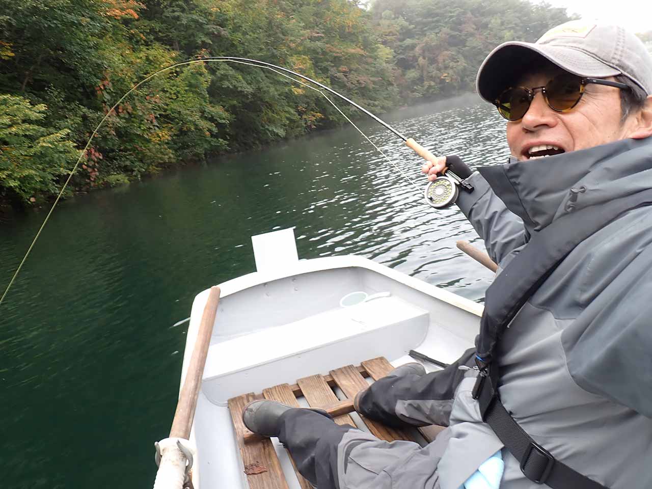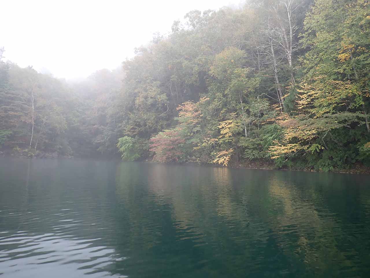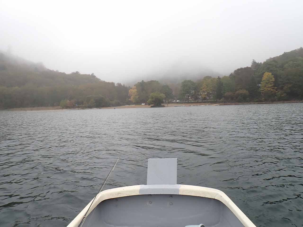 丸沼の岸辺には4〜5名のダブルハンドキャスターとルアーマンがいるけれど、湖上は霧に覆われていてどれだけ船が出ているか分からない状態。この季節はいつもならばダムサイト付近が釣れるので、行く手を拒む霧に惑わされないように、岸辺近くを伝ってダムサイトを目指す。かつてハーミットがシーバスガイド船をやっていた頃、こんな霧の状況で船を出した事があるが、マリンコンパスがあるにも関わらず全くどこにいるのか分からず、遠くの大型船が放つ霧笛を聴きながら船を進める恐怖を少し思い出した。