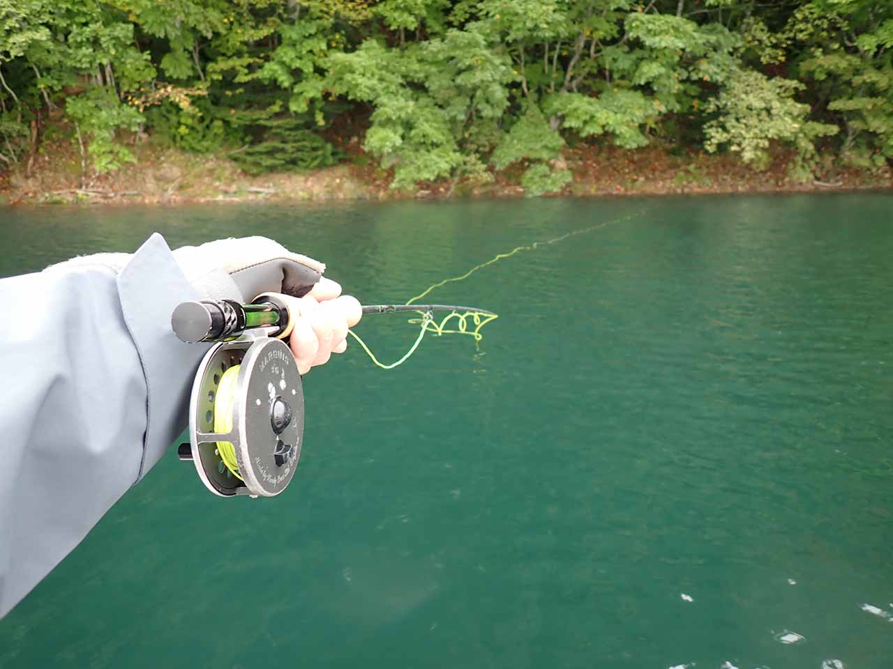 なんとかダムサイトに辿り着くが、湖面にはライズはなく寒くて虫が全く飛んでいない状況。さらには霧は小雨になり5番ロッド一本しか持って来ていないので、沈めてリトリーブする事もできず。仕方なくインジケーターを付けてニンフを沈めると、イワナが掛かったかと思ったらニゴイが釣れる始末。あぁ、まさしく八方塞がりの五里霧中。こんな時、あなただったらどうしますか?