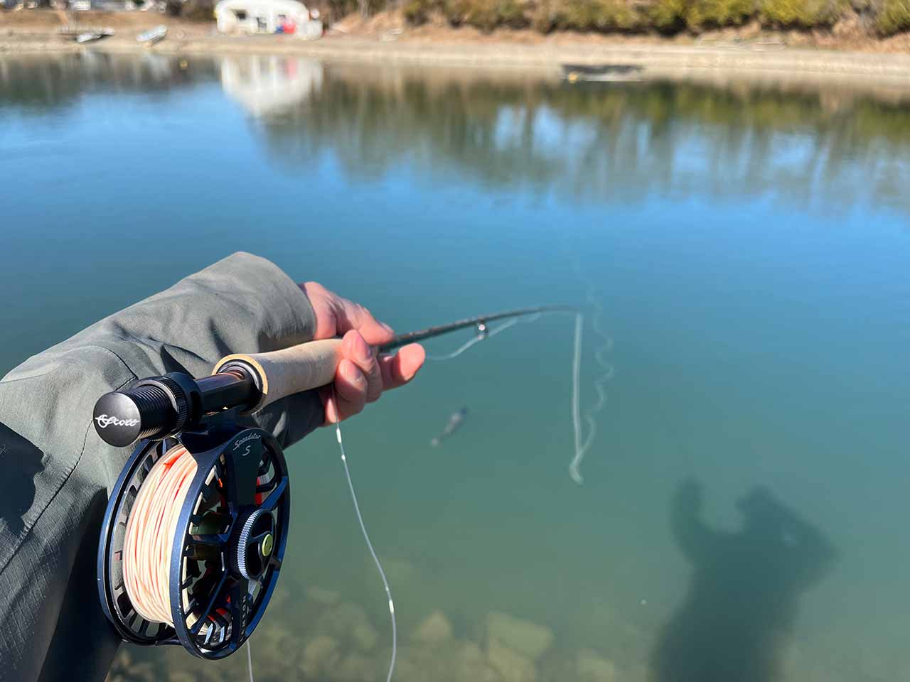 加賀FAのフライフィッシングは、多くの方がシンキングの引っ張りスタイル。でも私は前回フローティングでズル引きが良かったので、そのスタイルを試すこ事に。遠投して沈んでいくナイロンリーダーを見をみて、糸ふけが走ったらそこからズル引き。するとワンキャストワンヒットです。約40秒沈めてもラインが走らない場合はゆっくりと引いて、丁度底を切ってその少し上を引いているイメージで引き続けていると、やはりアタリがあります。