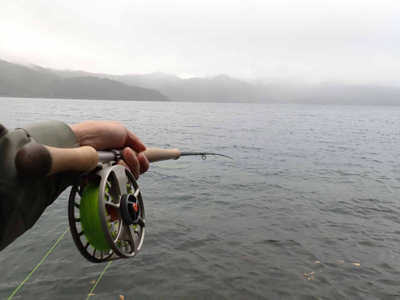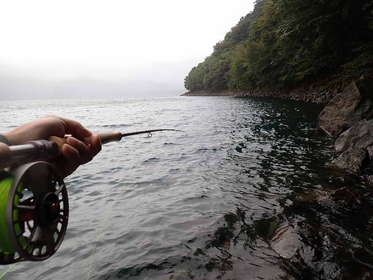 普段あまり入らない急深の場所に立ち沈めまくりましたが、リトリーブ最後で手前の石にフライが喰われてしまうばかりでした。なんか足湯に使っている様でこのまま釣り続けても何もないと感じた私は12時まで粘って本栖湖を後にするのでした。