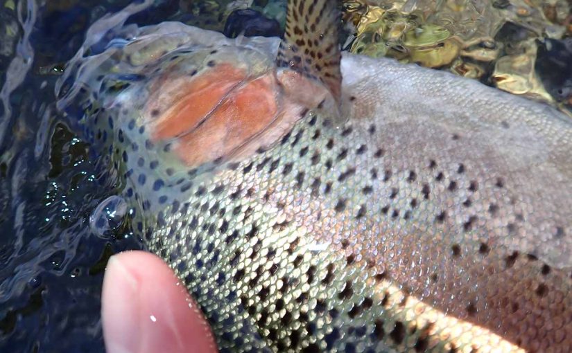 水深が無いので私のタックルはウィンストンのマイクロスペイにレージコンパクトライン。それにインターミディエイトのシンキングリーダー10フィート。ティペットは2Xを1m。フライはMSC風の大ぶりなニンフ#8とゾンカー#8を使用。お魚のコンディションは良く、サイズは50センチ前後といったところ。
