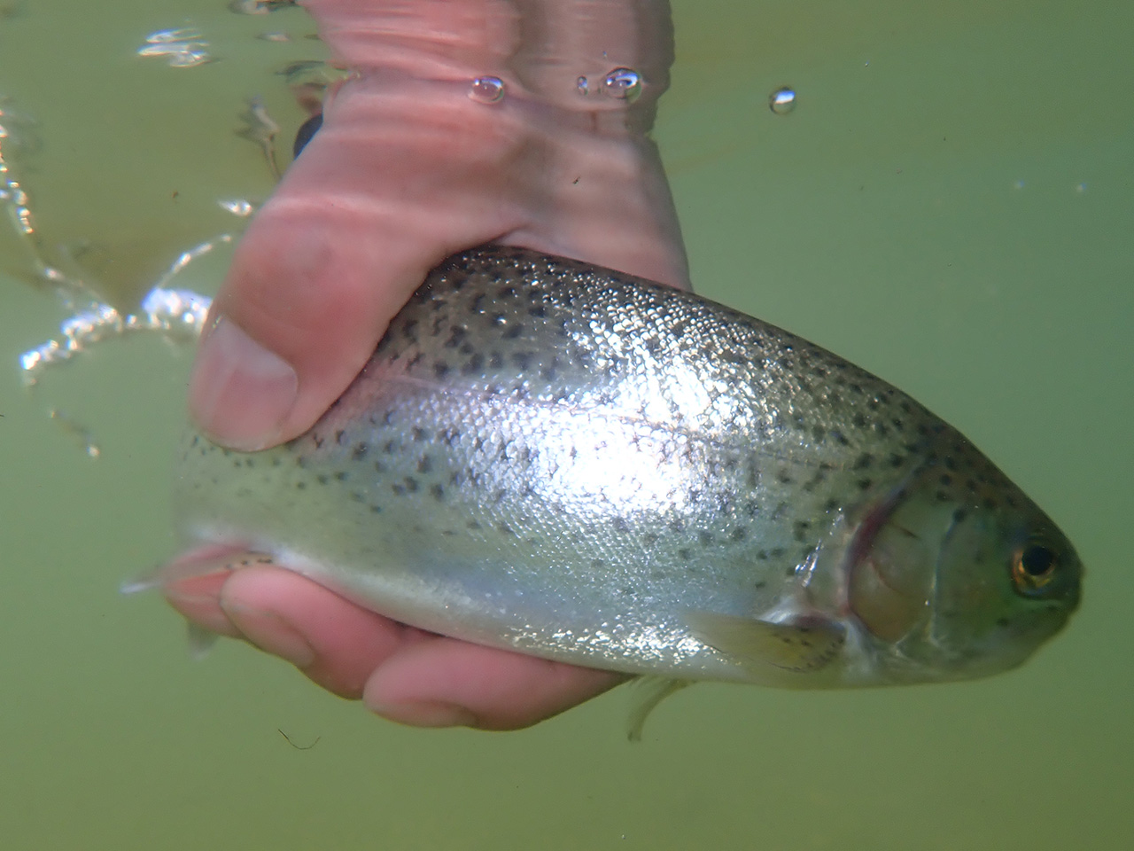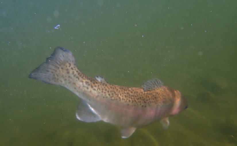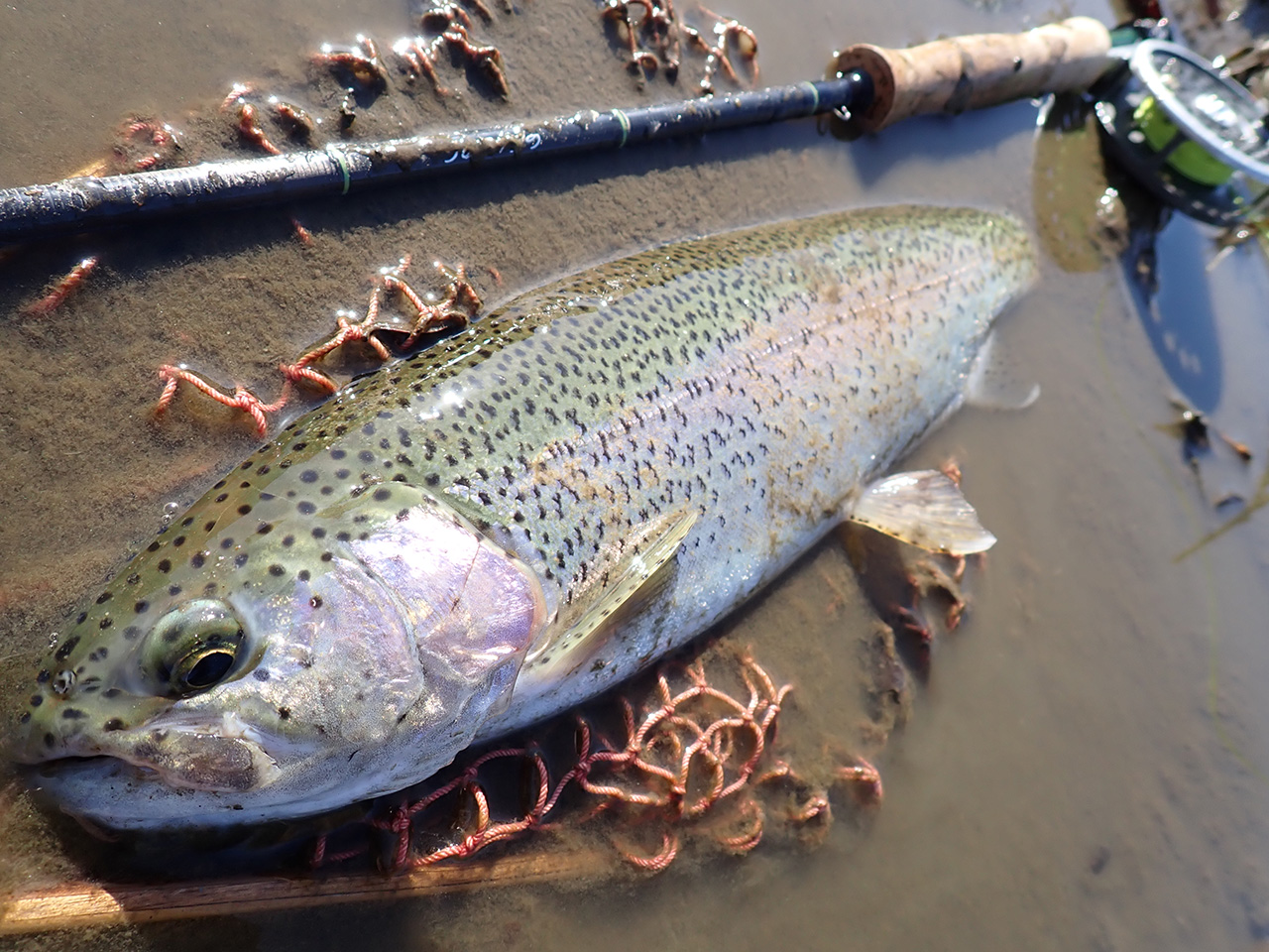 コンディションの良いレインボーはヒットしてすぐにジャンプするので、そのやりとりはスリリング。バーブレスフックなのでランディング率は約半分。ヒットして底へグイグイ持っていく様な引きの個体は胸鰭が欠損していることが多い。お魚のサイズは40センチ弱から50センチ弱と言ったところ。飽きる事なくヒットしてくれます。