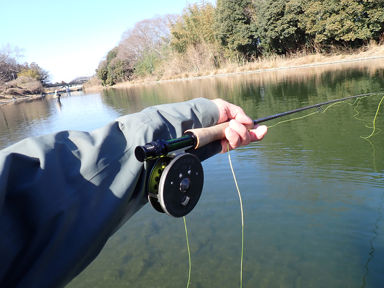 ロッドはスコットのセッション905/4。リールはハーディのマーキス6サイズ。ラインはクリクリになったものを引っ張って伸ばすのですが、寒さの為に巻かれた時の形に戻ってしまうのです。しかし、お魚とのリールファイトをやめてランディングまでラインを全部たぐってみたら、クリクリの巻き癖はいつの間にか無くなってました。