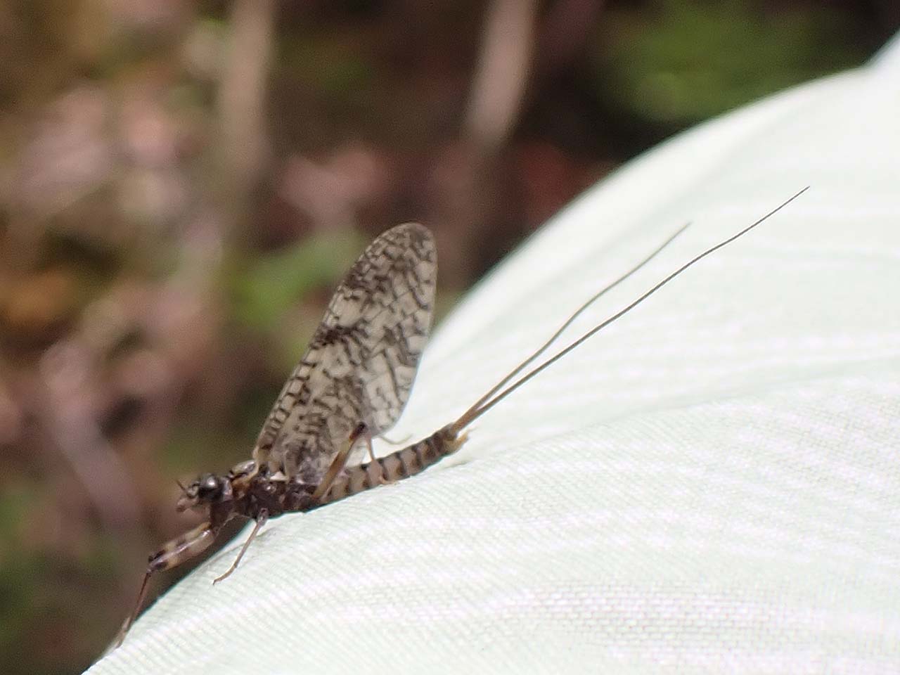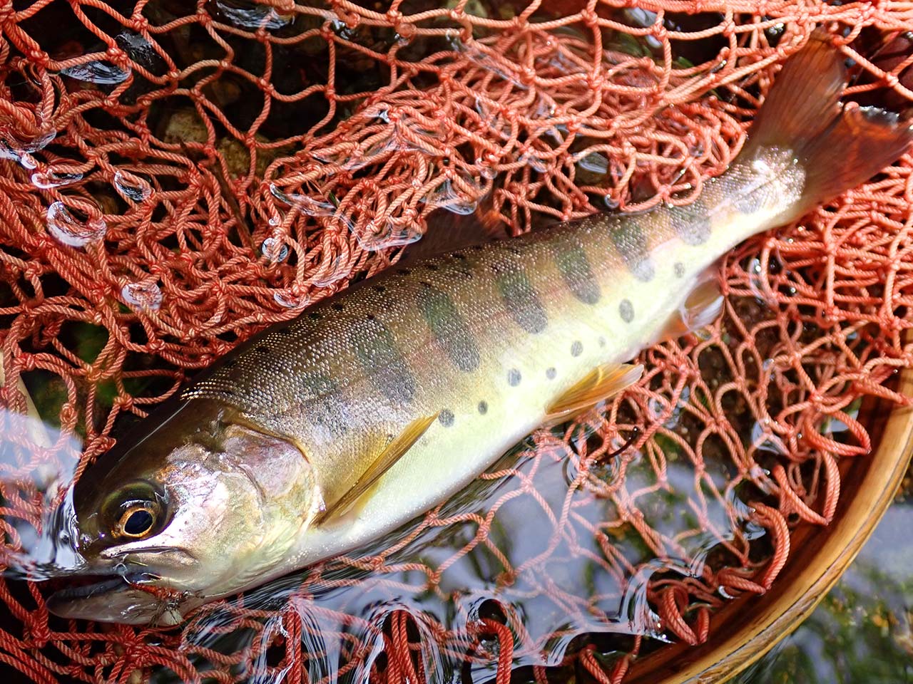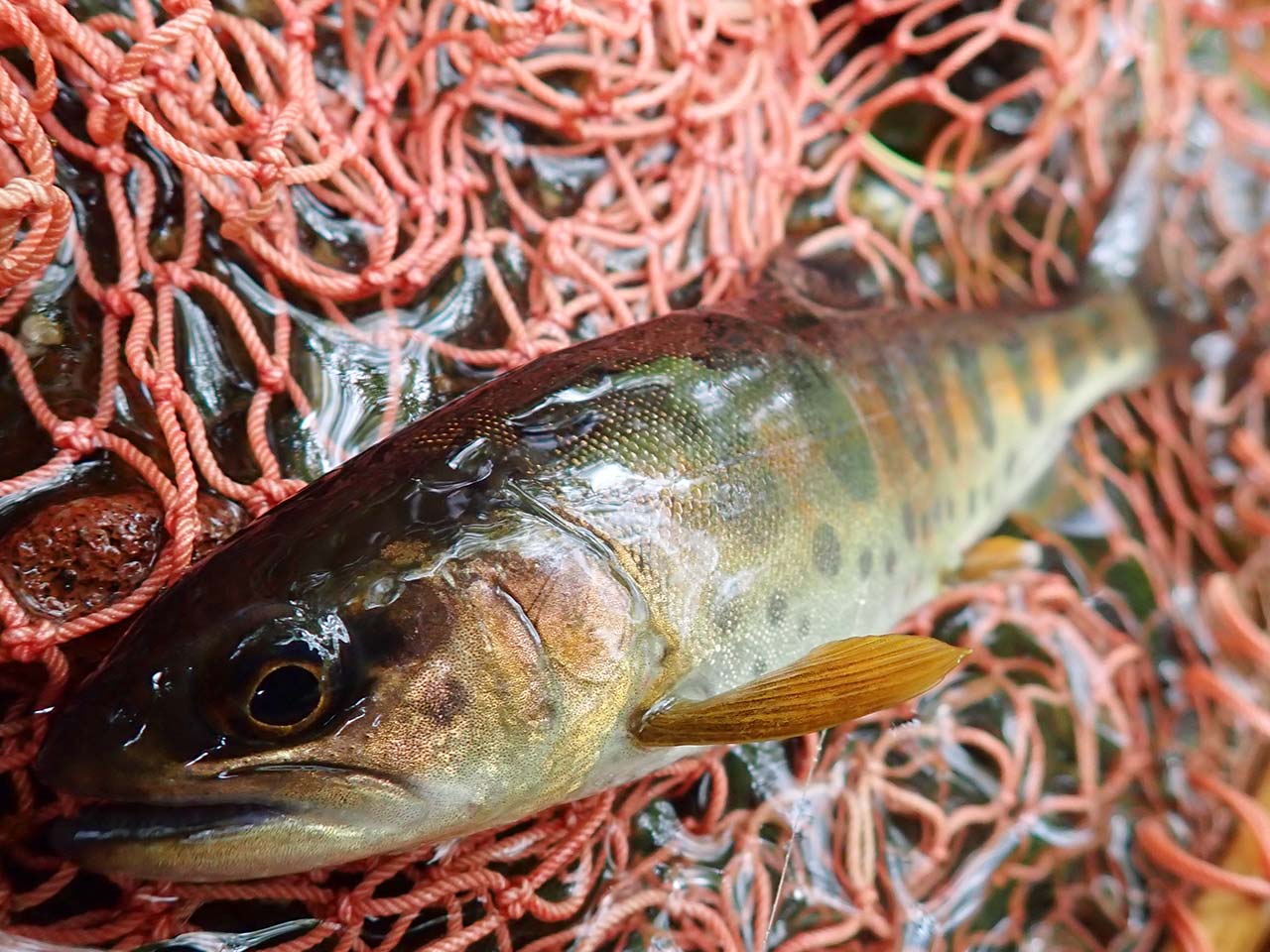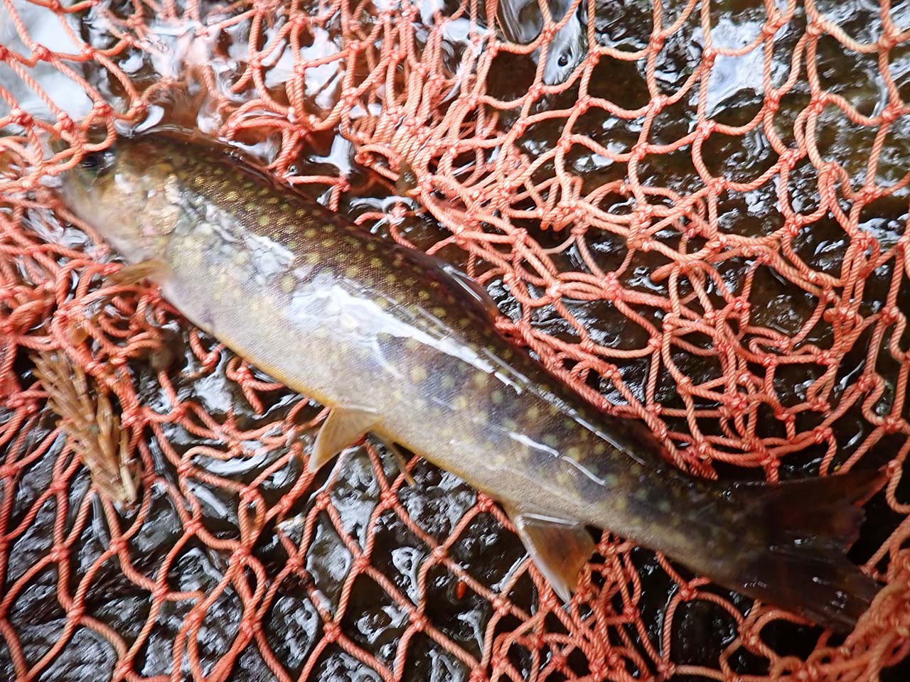 そして夕方の時合いの最後の最後にようやく釣れたのはデッカイハコスチではなく、このおチビちゃん。ガッチリと6番のウェットを食い込んでます。C&Rの釣りだから魚を値段に換算してはいけないけれど、¥3,000を払ってリリースできたのがこの一匹です、トホホ・・・。