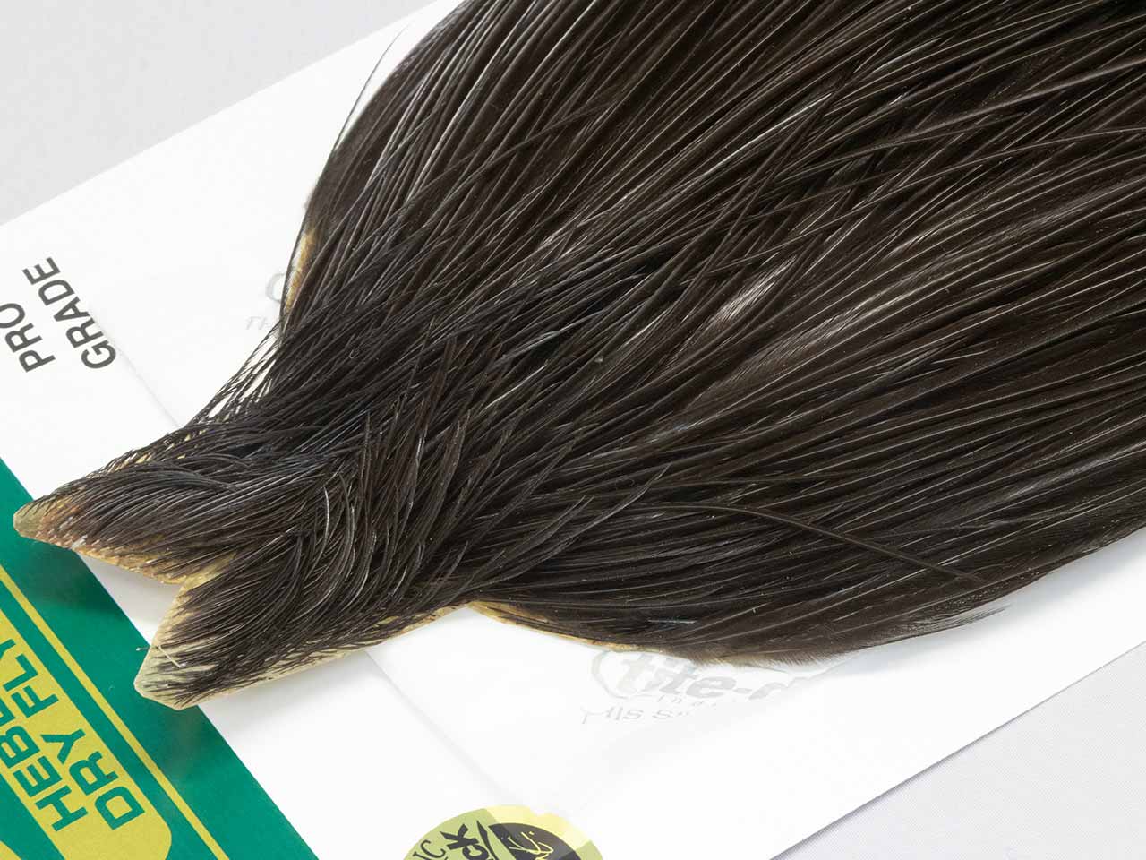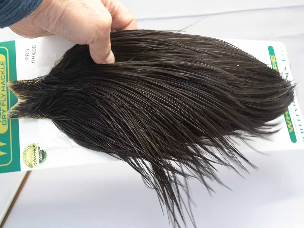 ヒーバートの特徴は鶏の大きさがホワイティングよりも一回り大きい事、それに淡い色合いのナチュラルカラー中心。今回入荷したナチュラルブラックで、ダイドカラーと異なりリアルさが増します。ブラックでも濃いブラウンという感じなので、クワガタなどの甲虫のボディにかなり近いカラーではないでしょうか。ここ数年ヒーバートのハックルはホワイティング以上に入荷が少ないので、商品を見てビビッと来た方は、迷わずポチッと押すことをお勧めします。