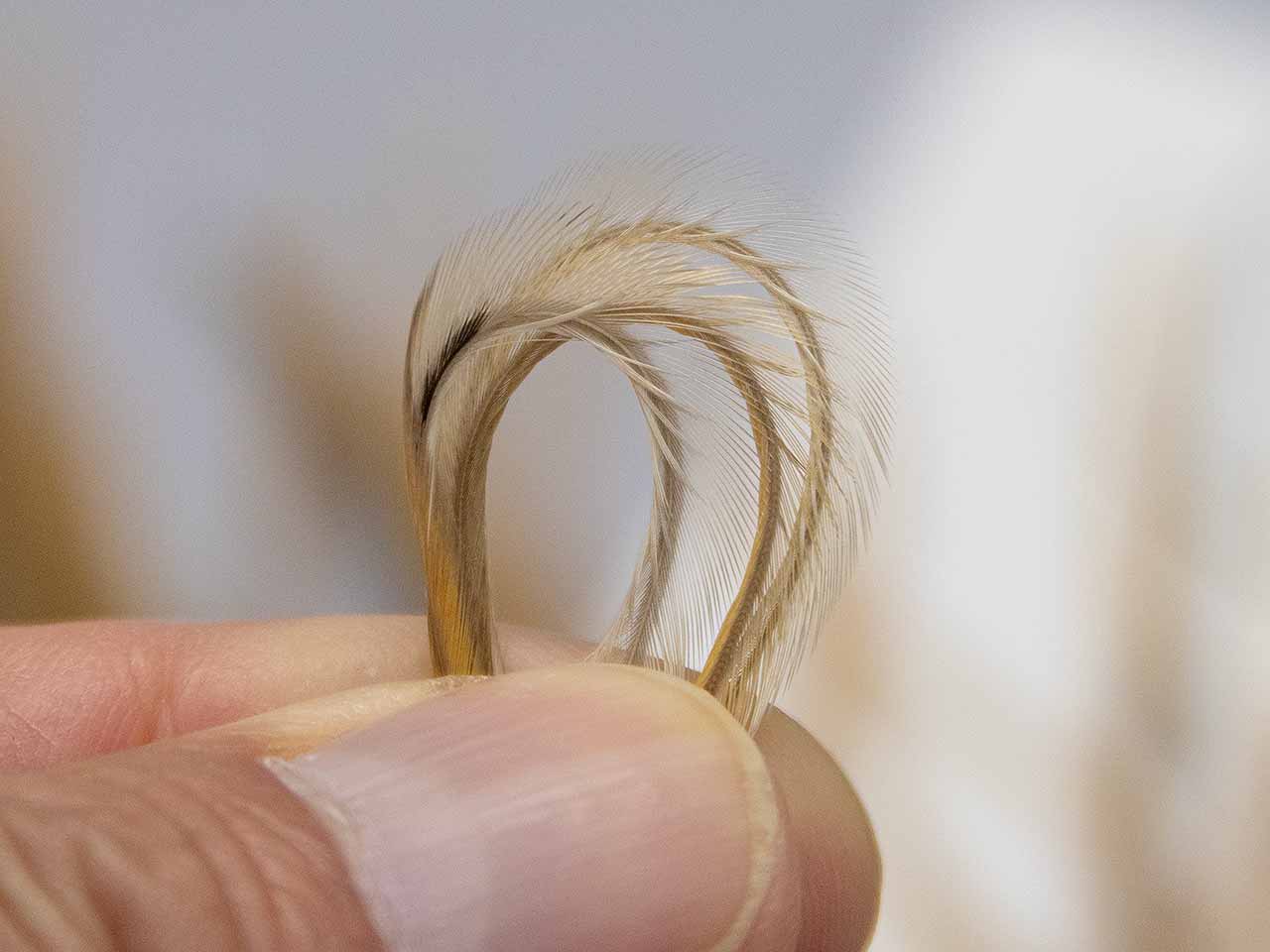 現在はホワイティング同様のグレード分けで届き、カラーだけがお店に届くまで分からないというもの。そして今回ハーミットに入荷してきたライトジンジャーダンです。メイフライのボディカラーやウイングに多いカラーで、その雰囲気を想像しただけで巻きたくなります。毛の質感はハイ&ドライで、ファイバーの長さが均一。比較的大きめのハックルも取りやすいので、12〜16番が作りやすいと思います。ヘリテージのサドルは他のモデルと同様にとても長いので、一本で8〜10本ほどのドライフライを巻くことが可能です。