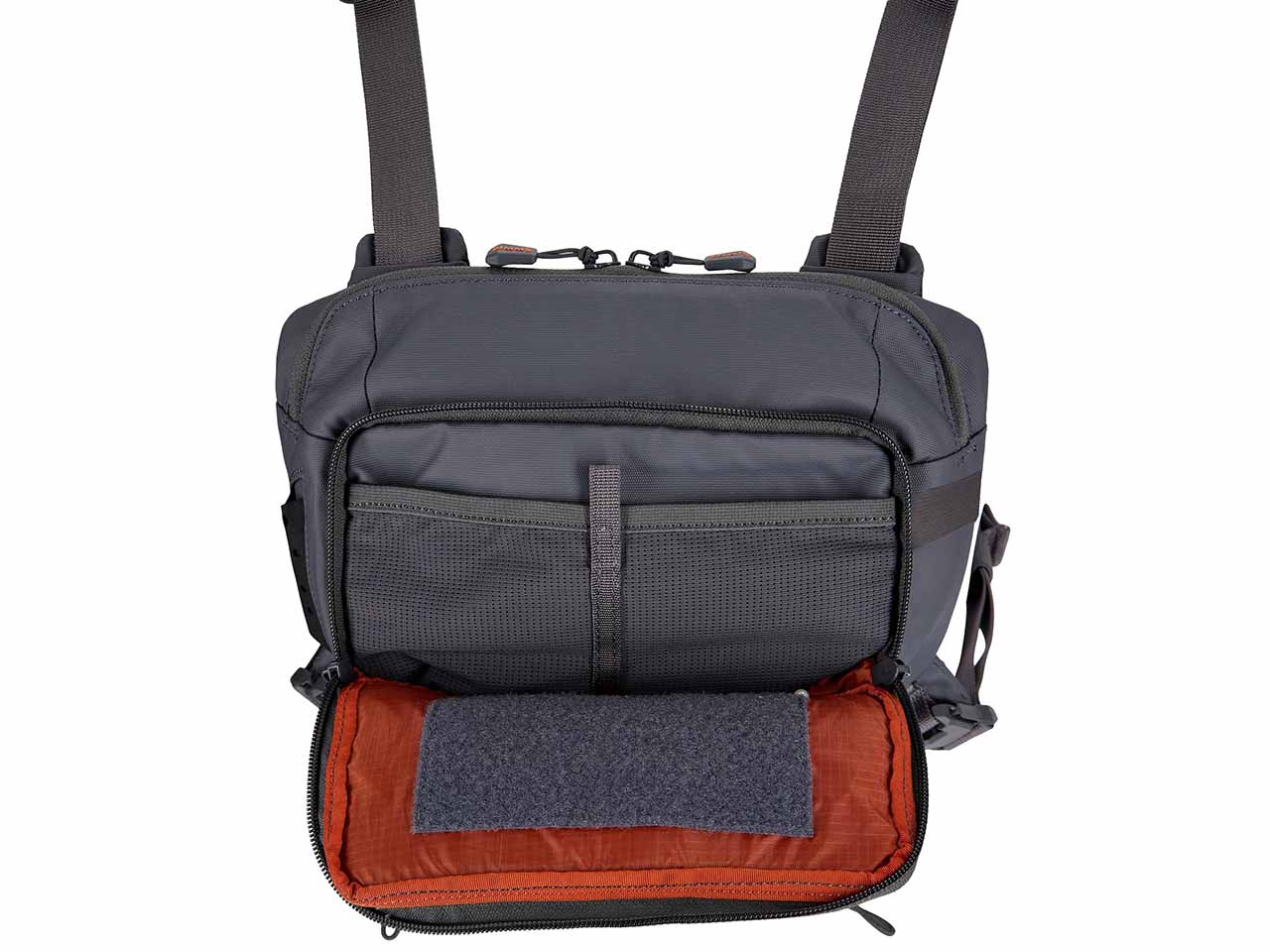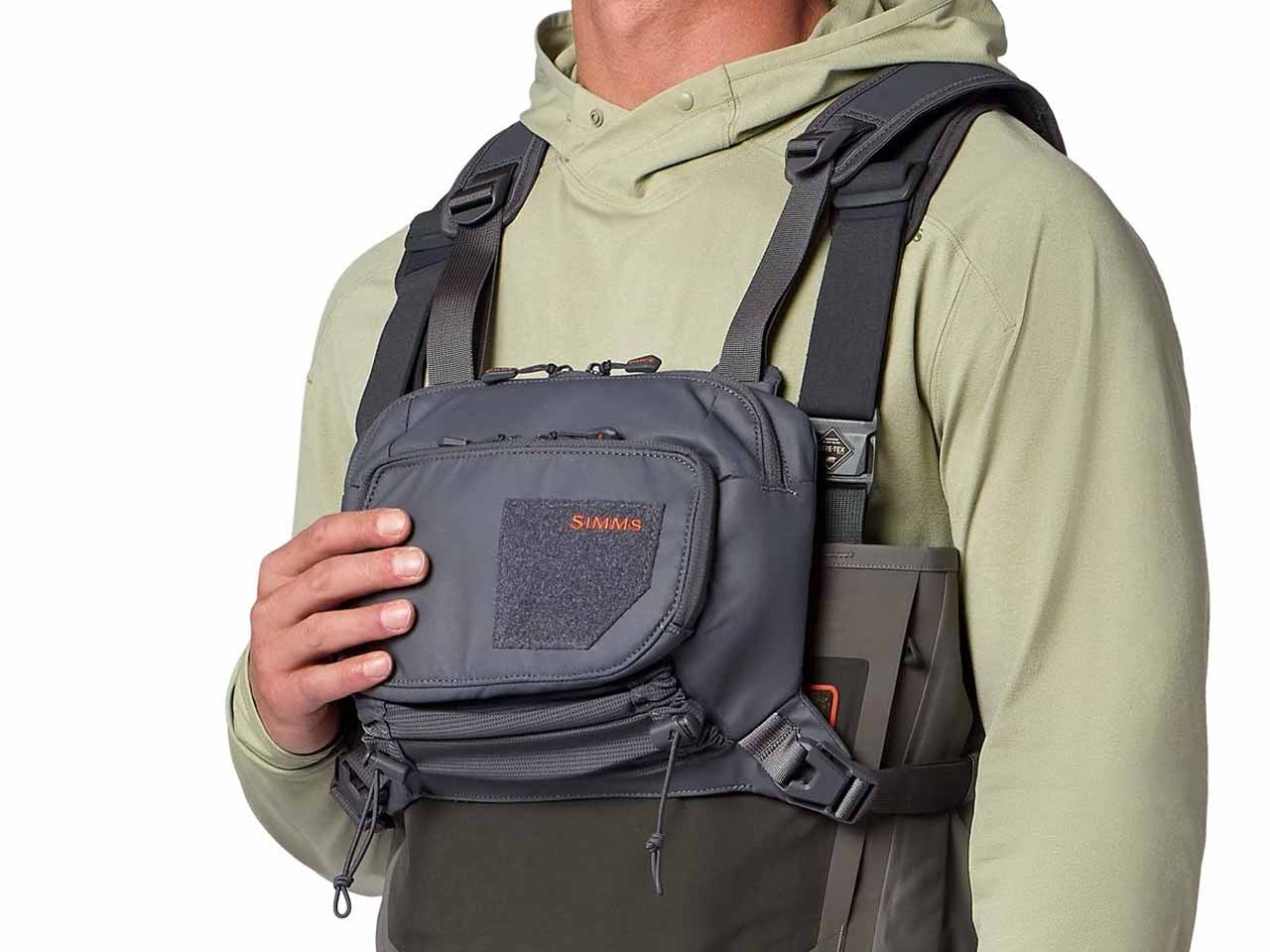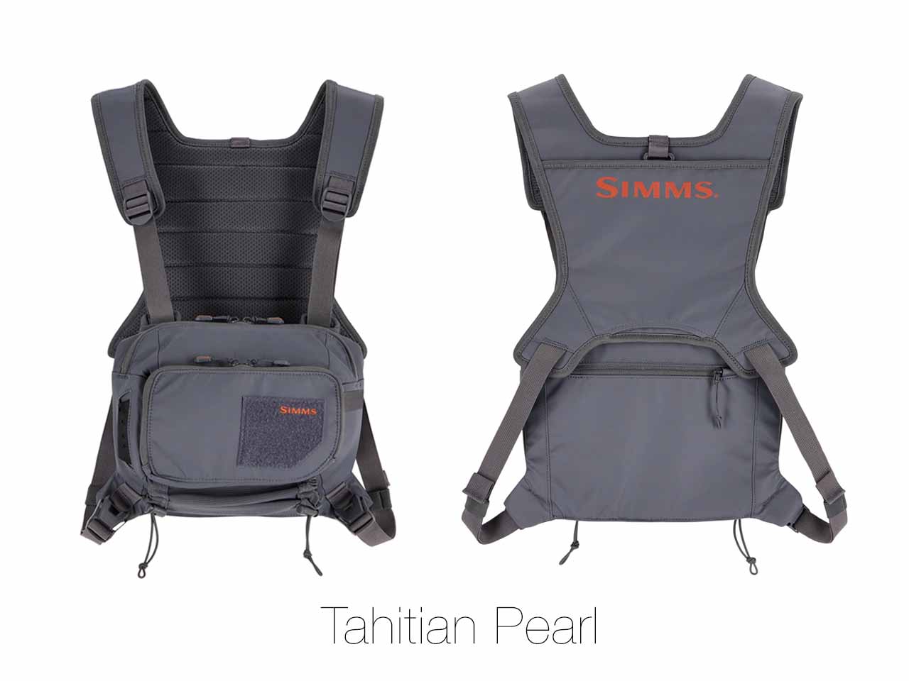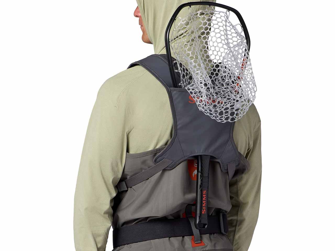 トリビュータリーのハイブリッドチェストパックは2026年にフルモデルチェンジし、雰囲気はヘッドウォーターヒップパックの生地を使ったシンプル版といった感じになりました。ヘッドウォーターの様なカチッとしたモールドの型ではないので、足元の視界は遮られにくく、そしてシンプルな構造なので、タックルを無駄なく配置できます。背面は以前のモデルと同様に、ランディングネットの柄を指すホルダーを装備。底部には両サイドから入れることができる、水筒やラインウェアを留めておけるストレージがあります。道具が少なくシンプルにまとめたい方に人気があります。