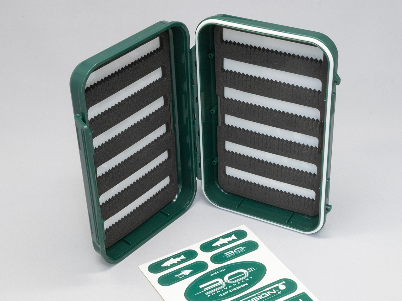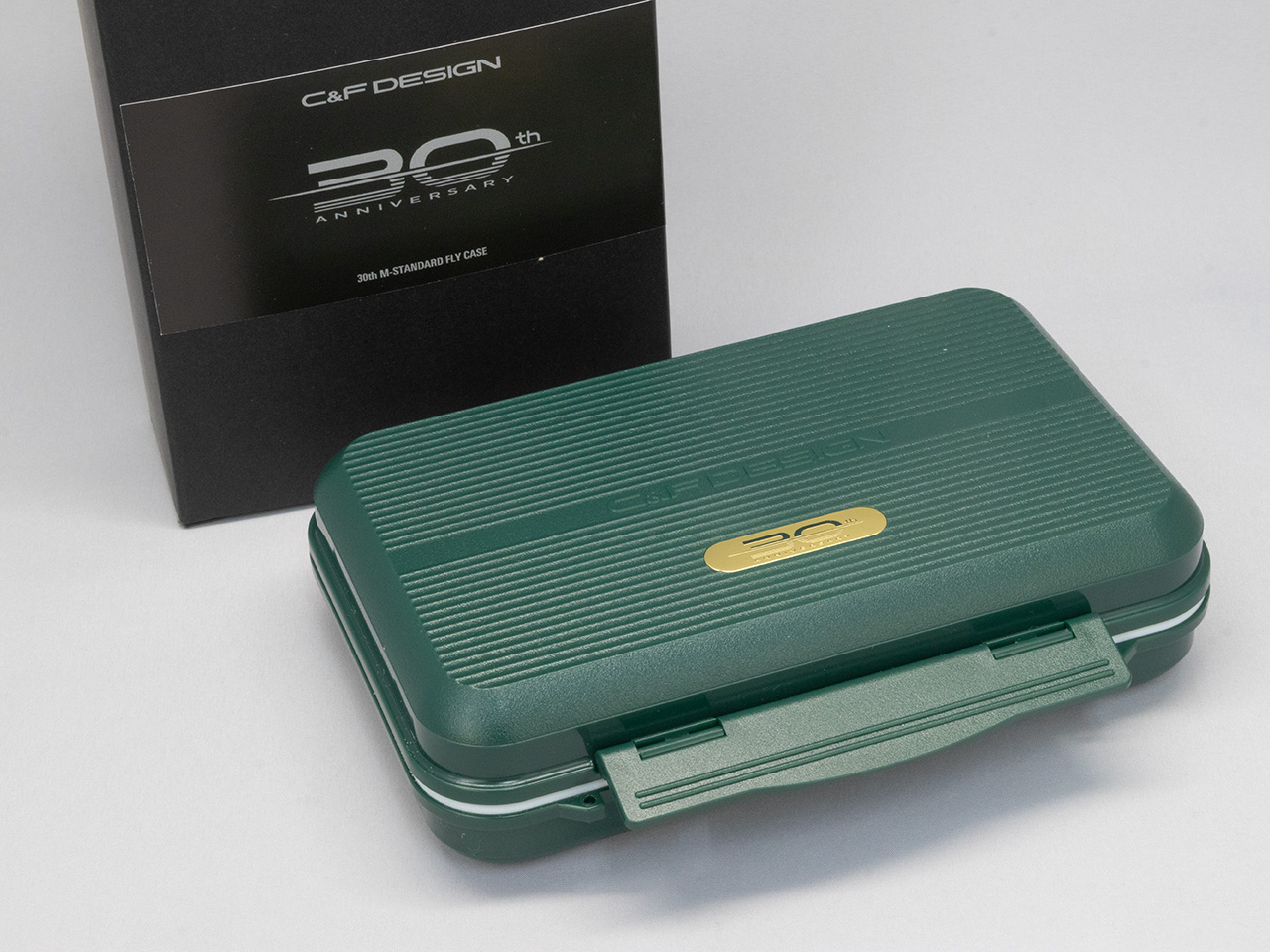 C&Fの30周年記念として作られたフライボックスで、こちらはサイズMの防水フライボックス。記念カラーとして作られたアニバーサリーグリーンは深みのあるグリーンで、ゴールドのエンブレムが輝きます。