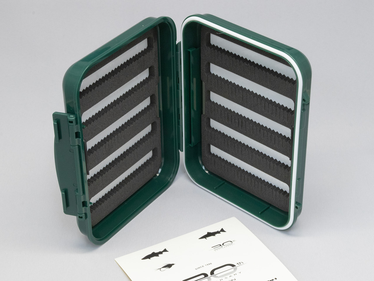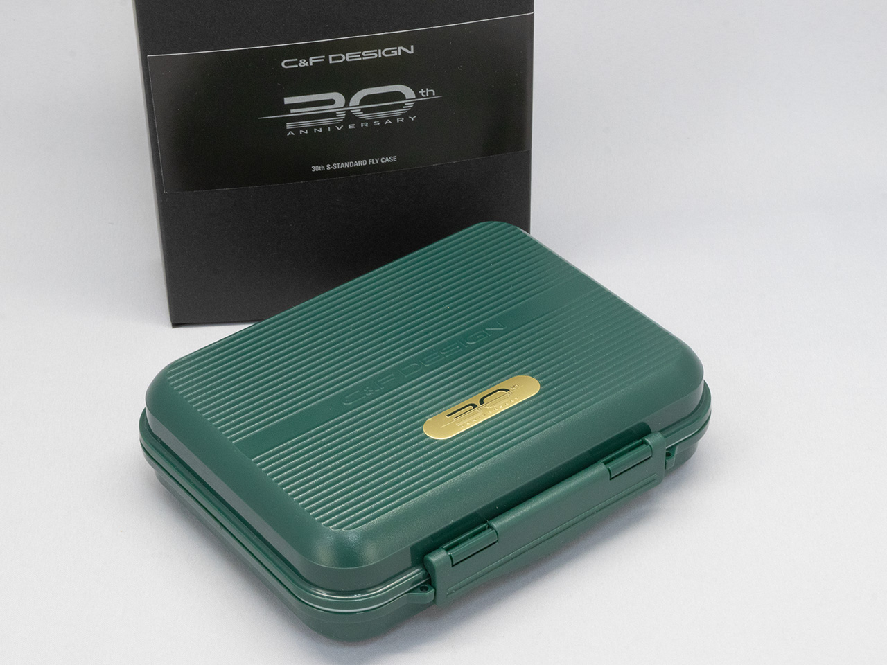 C&Fの30周年記念として作られたフライボックスで、こちらはサイズSの防水フライボックス。記念カラーとして作られたアニバーサリーグリーンは深みのあるグリーンで、ゴールドのエンブレムが輝きます。