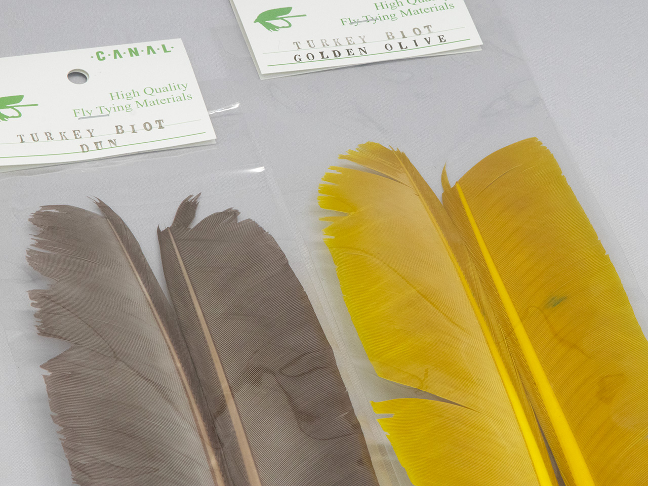 日本で染めているキャナルオリジナルのターキーバイオット。使うのは軸の内側にある短い方を一片使うので、一袋あればたくさんのフライを巻くことができます。グースバイオットよりも一回り大きいので12番くらいのフライまで対応できるでしょう。発色がよく、色の濃淡がよく出る。巻き始めの方向により、フリュが立ったり、ツルッとした濃淡のボディに仕上がります。また、グースバイオットと違い、反対側も同じようにボディ材にしたり、ウイング素材として使うこともできます。