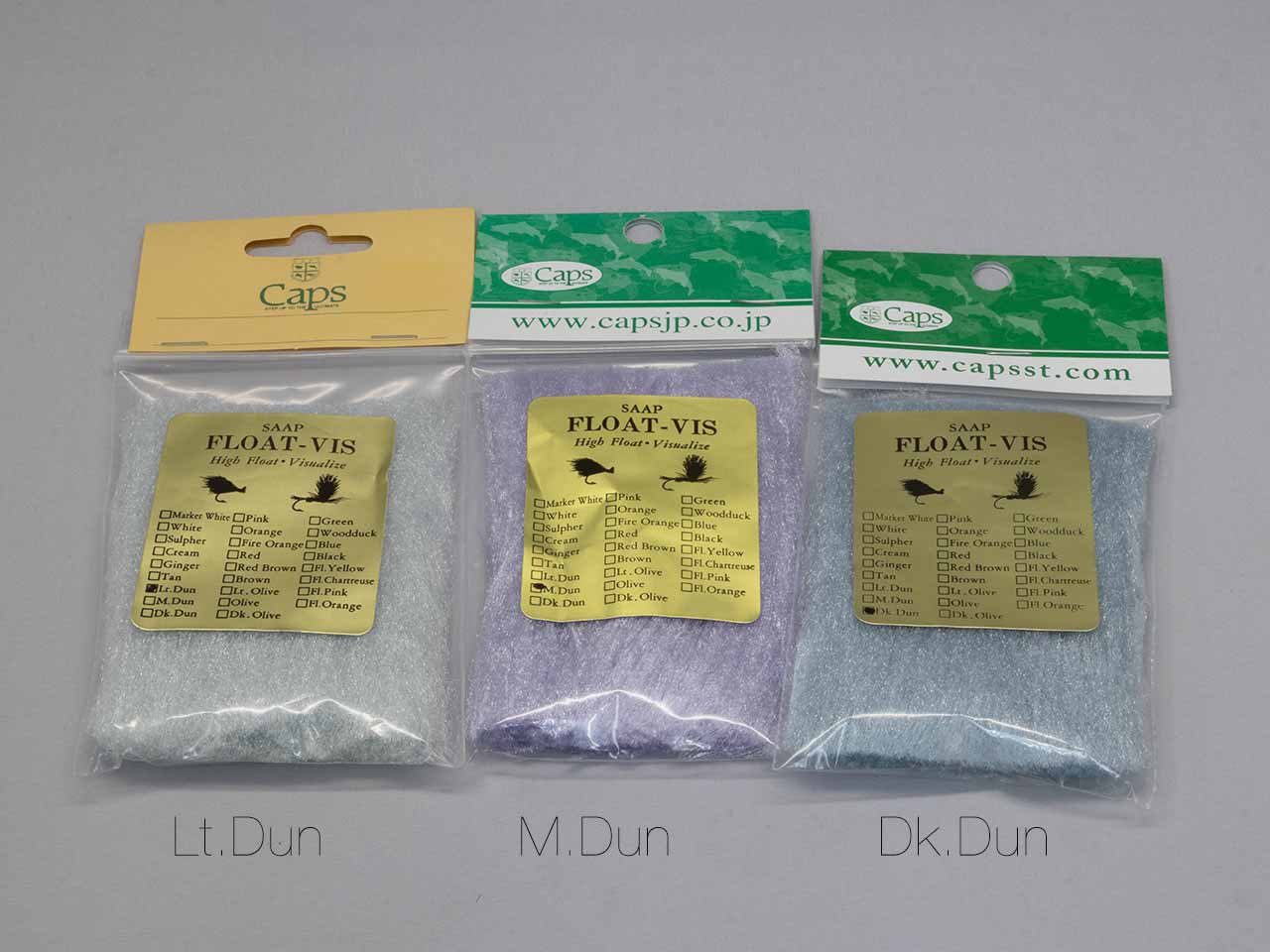 浮力が抜群(吸水性が無い)のマテリアルです。約85mmの繊維の束でエアロドライウイングと比べると、束の量を自分の好みで太さが変えられる点が優れています。明るい色ははパラシュートフライのポストウイング。ナチュラルカラーはダンのウイングやマシュマロボディを作る時など、クリーム系はシャックとして使います。マーカーホワイト(ナチュラルホワイト)は名前の通りそれを束ねてヤーンマーカーに最適です。レッドはフローティングミノーを代表する、ストリーマーのギルに使いましょう。